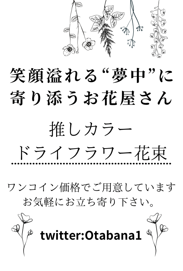 おはようございます!福岡にあります、夢中に寄り添うお花屋さんotabanaです!いつも応援して下さり、ありがとうございます!近頃、『お花』を通じて、人と人との繋がりが広がっています。心に秘めていた想いを声に出して言うことって大事なんだなぁと感じます。また、伝えた結果、その気持ちを応援して頂けることは、本当に有難く、幸せなことだなぁと思います。いつも見守っていて下さり、ありがとうございます!話は変わりますが、数日前、悩みに悩んだ末、文章がまとまらず、下書きで止めておいた活動報告がありました。下書きにしていたつもりでしたが、どうやらうっかり投稿をしてしまっていたようで(寝落ちしていました)ご支援下さった方から「文章が途中の活動報告がアップされてるよ」と教えて頂き、冷や汗が止まらなくなるくらい焦りました。汗かなり赤裸々に書いており、見ることが出来た方は私の書いている時に抱えていた不安な気持ちやぐちゃぐちゃな頭の中も垣間見ることが出来たので、かなりラッキーだったと思います//笑いえ、冗談です//大変失礼致しました!以後、気をつけます。また、せっかくなので、その時の文章を再編集して、投稿します。***最初に私が、『熱い想いを持つお客様(=オタク)向けのお花屋さんをしたい!』そう打ち明けた時、大抵の人は、「どういうこと?」「なんか急に企画みたいなこと言いだしたな」など…きっと、大なり小なり戸惑う気持ちがあったんじゃないかなと感じています。ただ、実は、私自身も本当に自分に出来るのか不安に思っている部分がありました。元々は、花の都パリで売られているようなおしゃれでナチュラルなテイストのお花が大好きで、そんなお花屋さんをすることを漠然と夢見ていました。フランスで学んだことや、これまでの経験からナチュラルテイストのお花ならお客様に自信を持ってオススメできる!そう思っていました。また、お客様に好きなテイストはどんなテイストですか?と質問したところ、ナチュラルな感じ!との回答が6.7割をしめており、需要と供給が成り立つ…とも感じました。現に、まだまだ駆け出しの私がお勧めするアレンジメントやフラワーレッスンを買いたい、受けたいと言って下さるお客様もいらっしゃいます。とっても幸せなことです。ただ、どうしても…壁がありました。もう有名になられているお花屋さんと渡り合い、それだけじゃなく、私の将来の夢である世界中を飛び回るフローリストになりたい!という夢には、このナチュラルが売りのお花屋さんという道筋では、難しいのではないか、そう考えました。(もちろん、今も中途半端な想いでお花と向き合っているつもりはありません!ナチュラルさが売りのお花屋さんも自信を持ってオススメ出来る私の誇りが詰まったお店です!私に夢などなく、普通に商売をしていくということであれば、やっていけるのかもしれません。)世界を飛び回るフローリストになるために自分に何が出来るだろうと考えた時に、身近な人をお花で喜ばせたいと願う自分とそのお花で喜んでもらえた経験が思い浮かびました。そして、それが世界に誇れる日本の強みであるアニメやアイドル、漫画などに繋がることだったので、「これだ!!!」と思いました。世界で活躍する為には、日本らしさは必要だと。アニメや漫画、アイドルをイメージ出来るお花が作れたら、世界中を飛び回るフローリストになれるのではないか、こちらが私が出した仮説です!これから、数年、もしかしたら、数十年かけて、検証してみます!不安な気持ちがあることを周囲に打ち明けたこともあります。でも、「徳留さんなら大丈夫!まずはやってみたら?」とアドバイスを頂けたことも私が踏み出す後押しになりました。まずは、今やらないと後悔しそうなので、思いつくアレコレに挑戦してみます!将来、世界を飛び回るフローリストになれたら、応援して下さった皆さんと、焼肉でビール飲みたいです!!私と乾杯してください!最高に美味しいでしょうね!!笑楽しみです!※近々、知り合いに、キャラクターのアクリルスタンドをお借りして、お花と組み合わせて、商品を試作してみます。またご報告します!otabana徳留