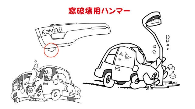 そんな時、付属のキャップを外して、窓破壊用ハンマーで窓を割れば、脱出が可能になります。