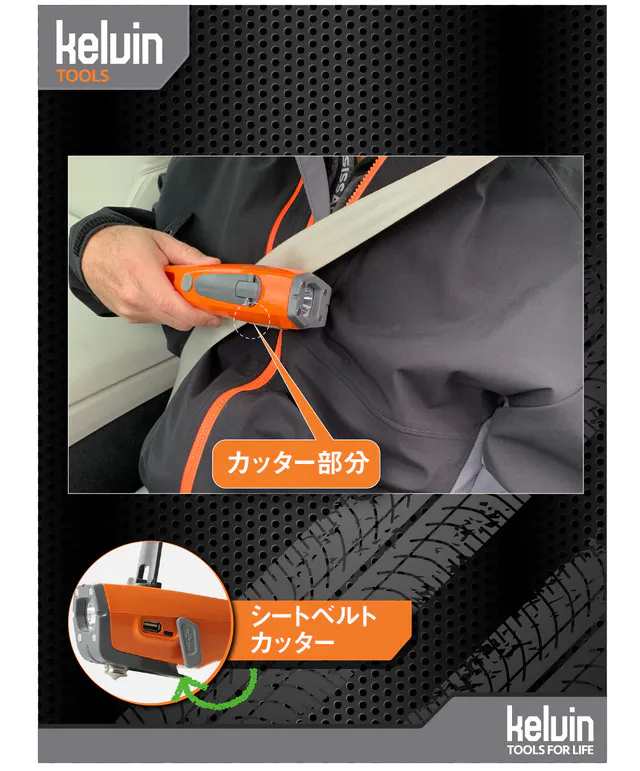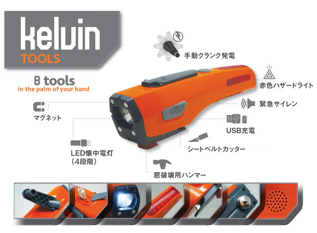 大切な家族を守るために、緊急時に役立つ8つの機能を1台に備えたKelvin8を車に常備していれば、もう安心です!