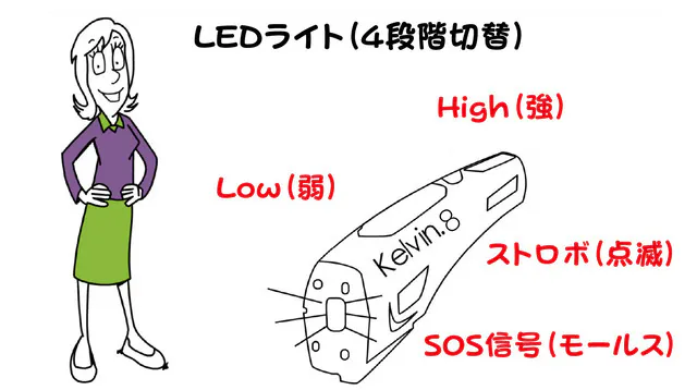 High(強)→Low(弱)→ストロボ(点滅)→長押し:SOS信号(モールス)