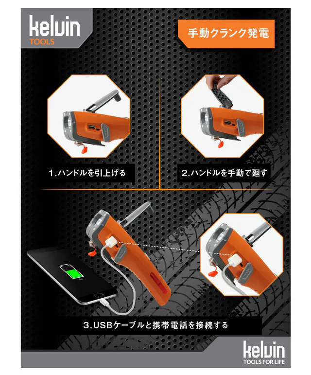手動クランク発電から、スマートフォンやモバイル機器のUSB充電ができます。
