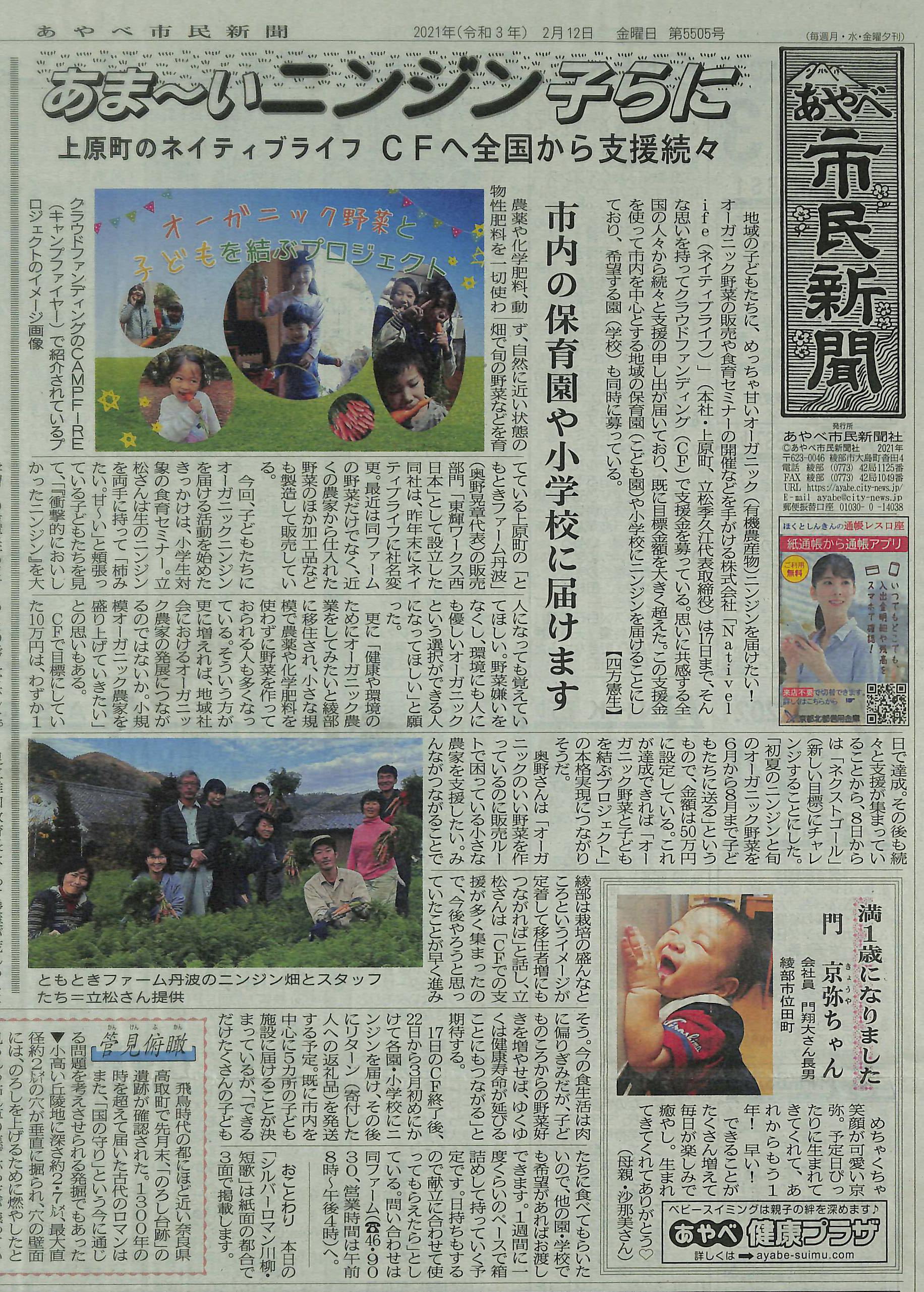 「オーガニック野菜と子どもを結ぶプロジェクト」が綾部地域でも話題になり、先日「綾部市民新聞」にプロジェクトが掲載されました。