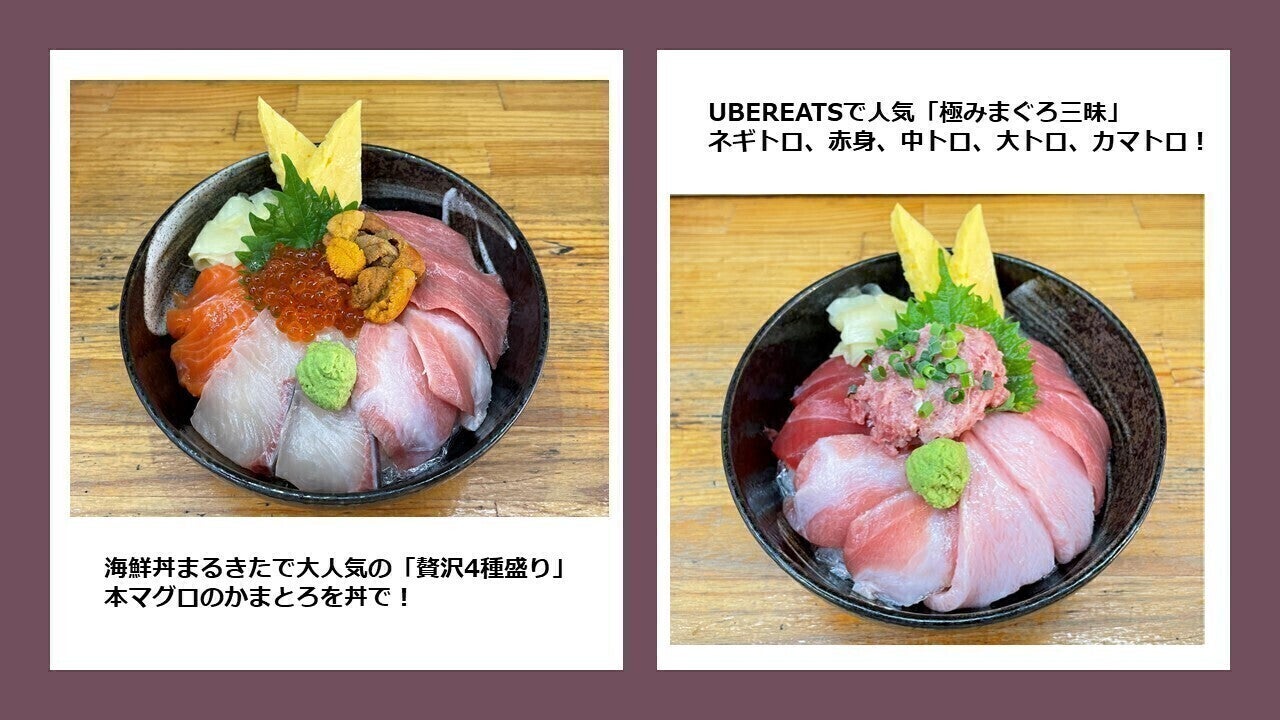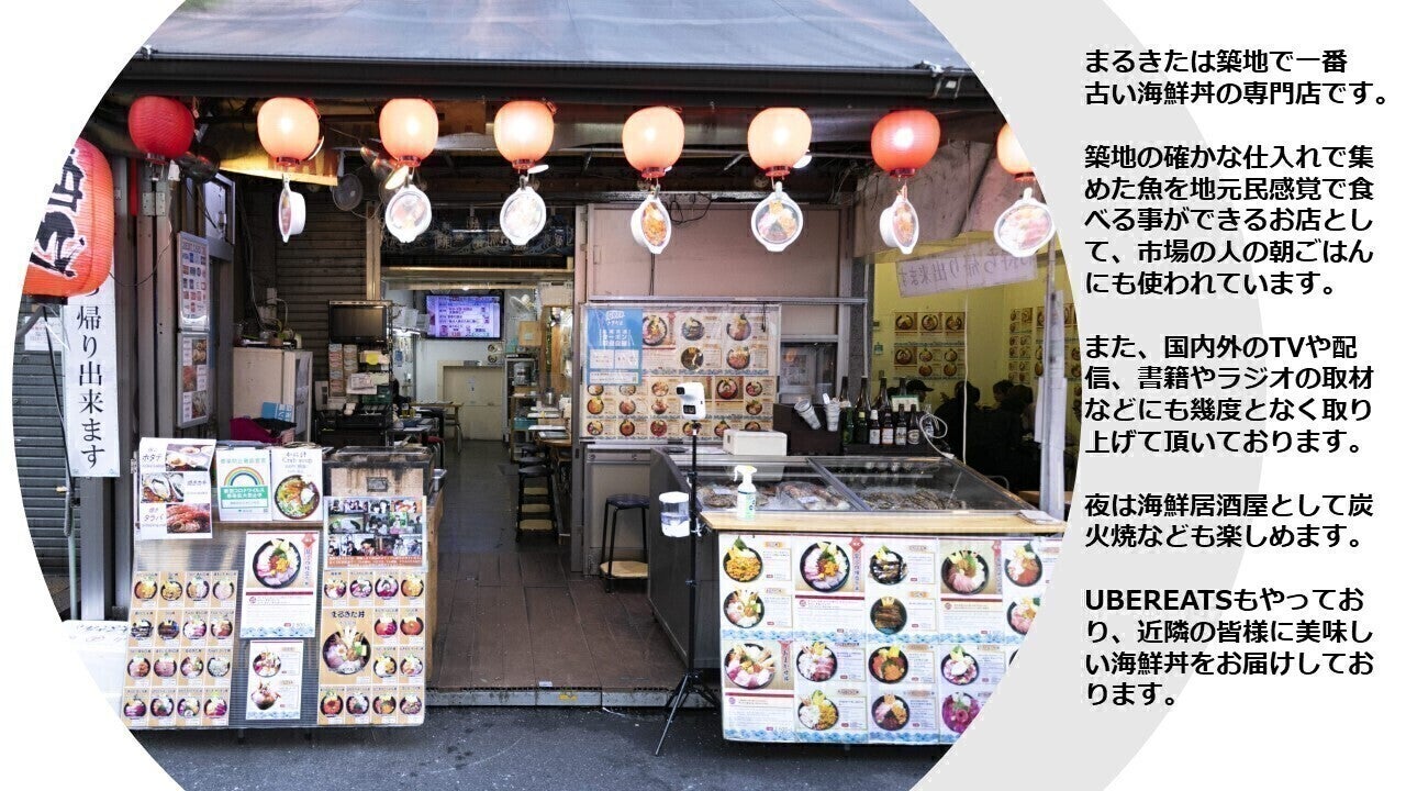 当店は美味しい築地の魚を海鮮丼でお腹いっぱい食べてもらおう。という社長の気持ちから生まれました。特にまぐろにこだわりを持ち、築地でも唯一の「本まぐろのカマトロ」「中落」「脳天」がどんぶりで食べる事の出来るお店として、コロナ禍前にはTV取材、雑誌、撮影などの案件、国内外より地元の方、個人団体の観光客の方問わず多数来店していただき、まるきたの海鮮丼を楽しんで頂いておりました。