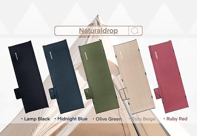 Naturaldropのコットは、デザイン性も重視。重量感のあるブラックと、鮮やかなレッドの組み合わせのベースフレーム。5色のベッドクロスはアウトドアのシーンに馴染みながらも彩りを添えます。