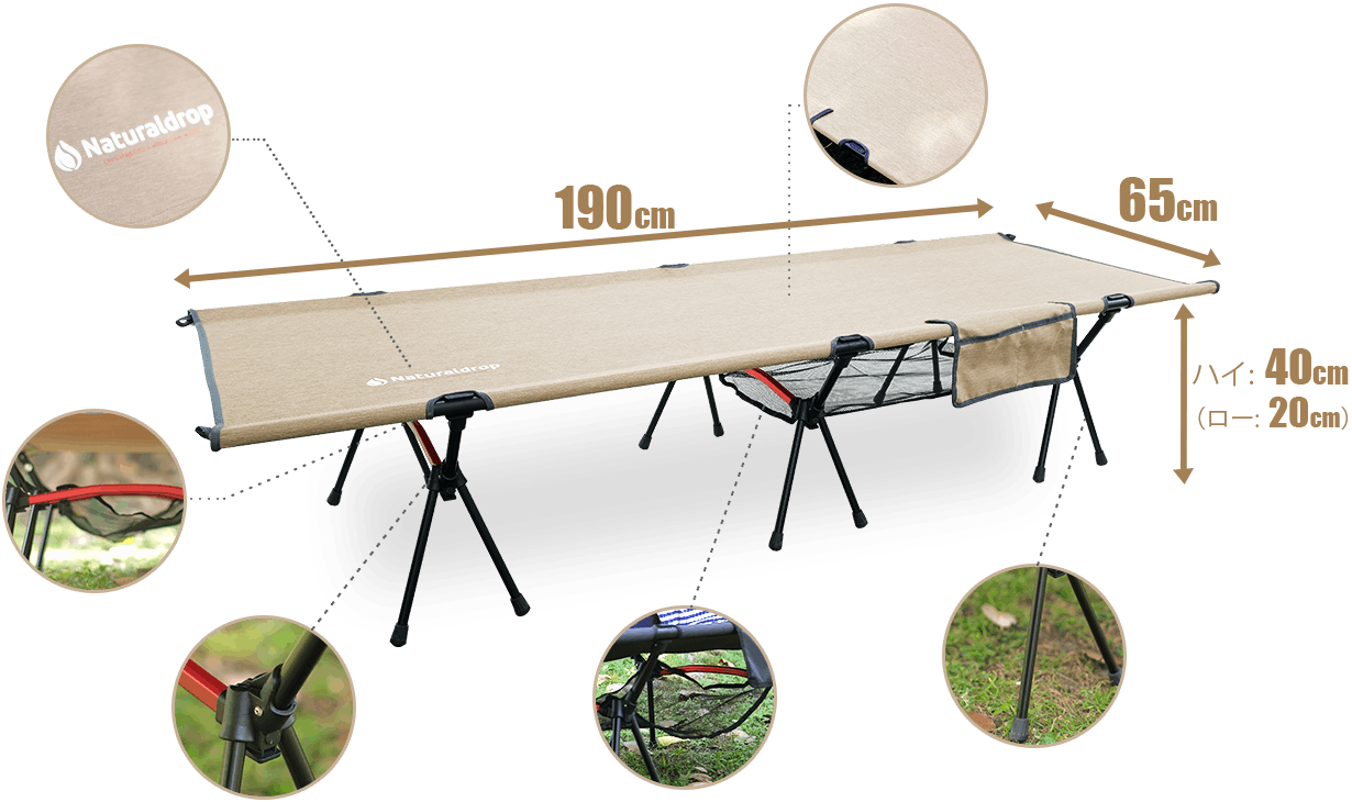 キャンプブームはこれからさらに広まり、市場に多く出回るようになるでしょう。中には安価で、購入しても使えないような品が現れる可能性もあります。ハイ/ローの2WAYで、様々な用途に合わせて利用でき、さらには安心して使えるNaturaldropのコットが遥かに経済的です。