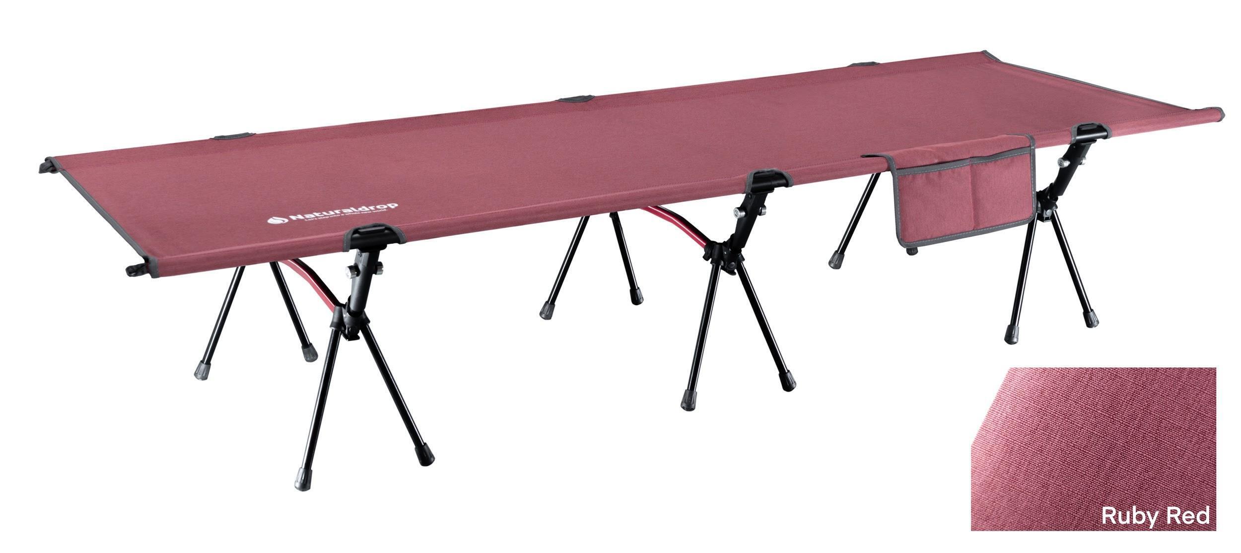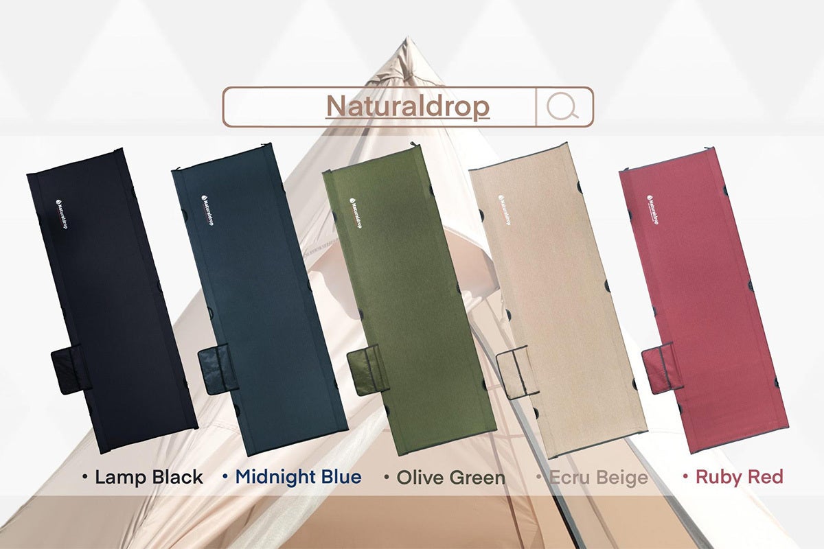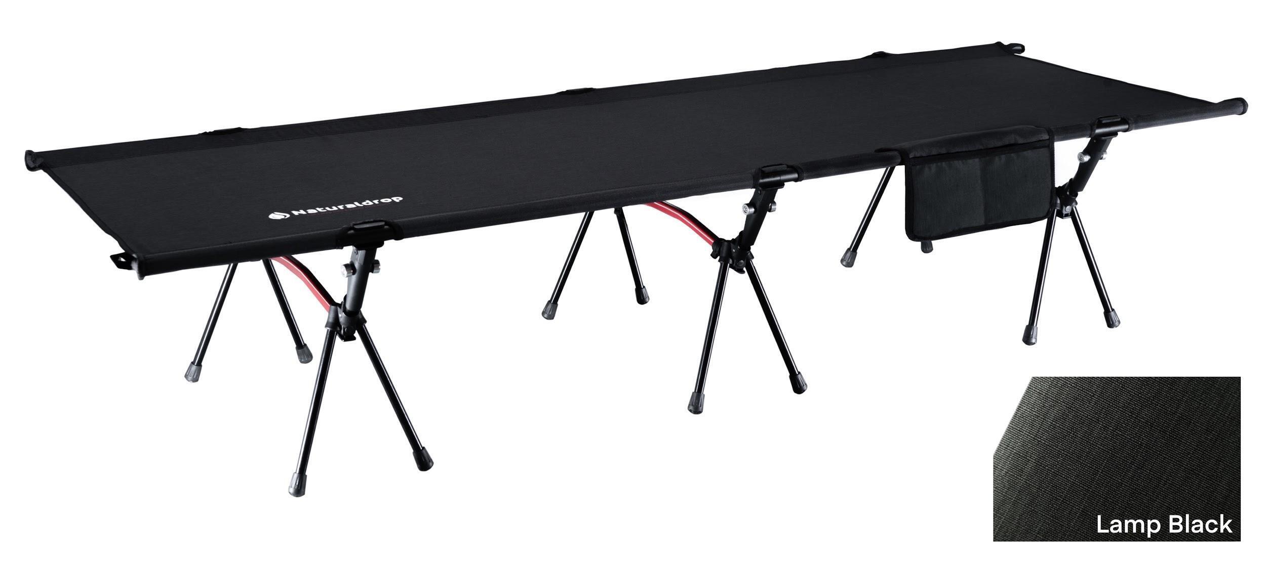 Naturaldropのコットは、デザイン性も重視。重量感のあるブラックと、鮮やかなレッドの組み合わせのベースフレーム。5色のベッドクロスはアウトドアのシーンに馴染みながらも彩りを添えます。