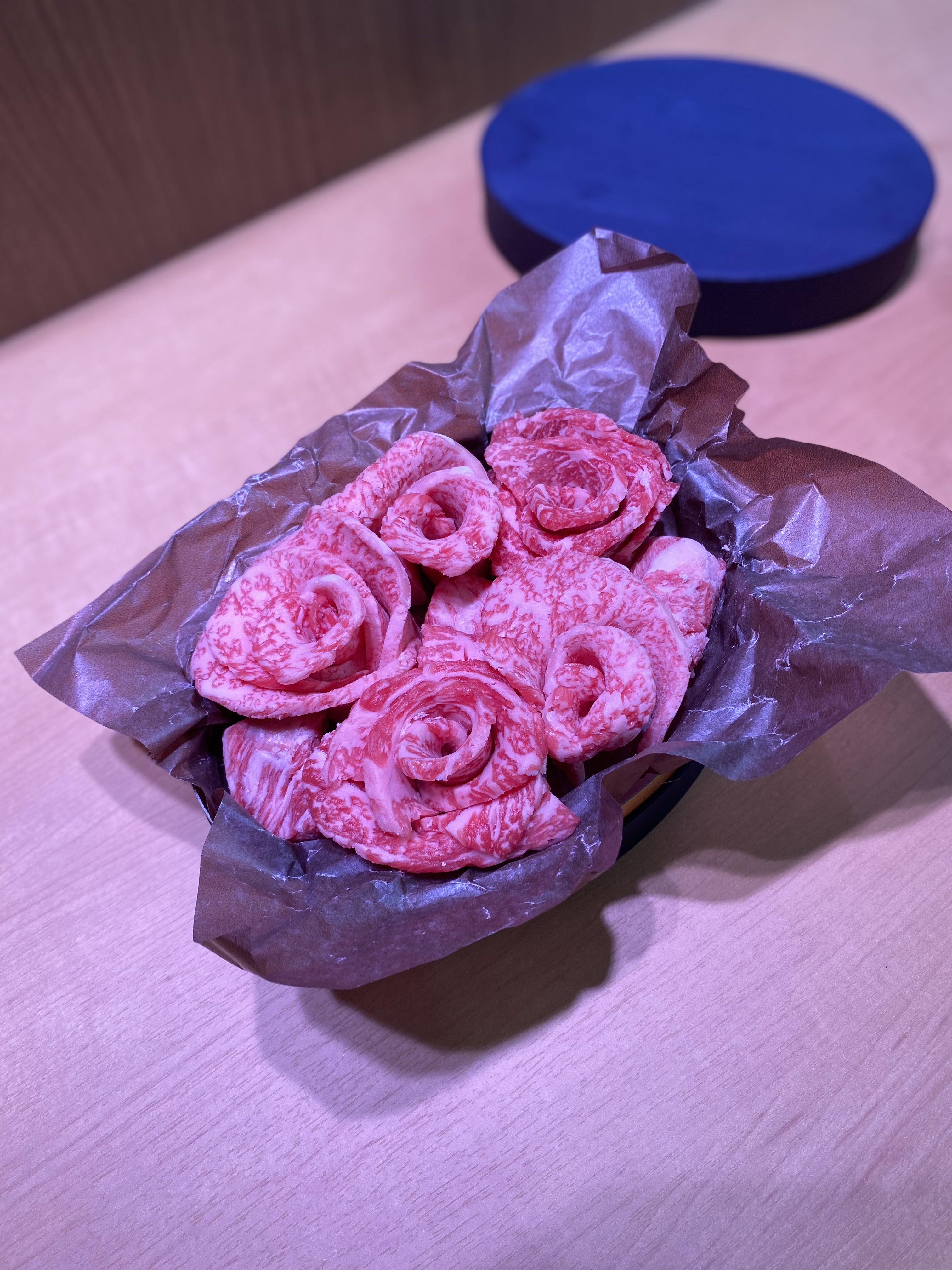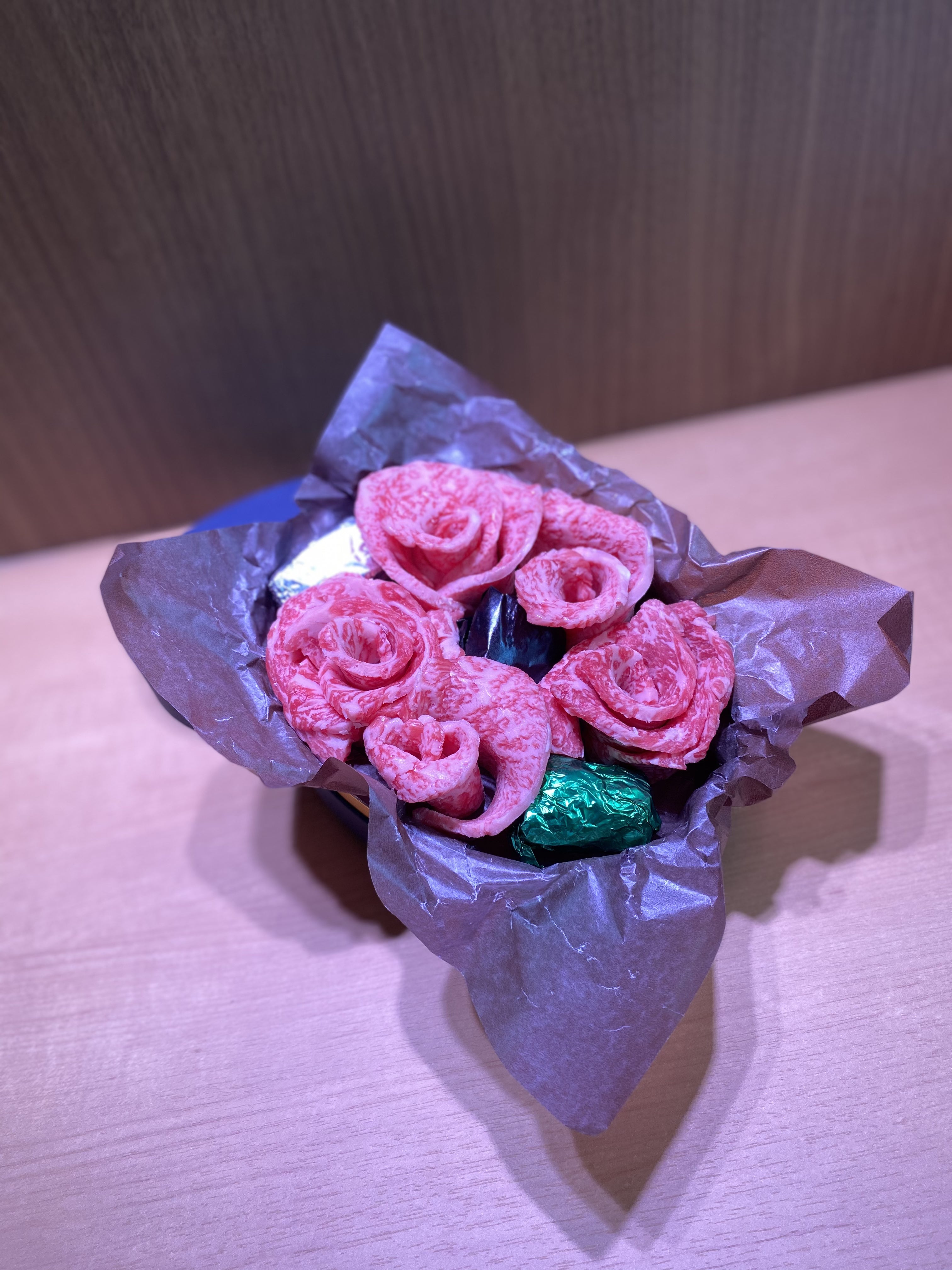 本日は、総料理長奈良原と母の日ギフトの試作を行いました。皆さんは1枚目と2枚目、どちらがお気に召しますか?肉容量は250gで、角切り肉を味噌漬けなどにして、銀紙に包んだバージョンとそうでないバージョンです。