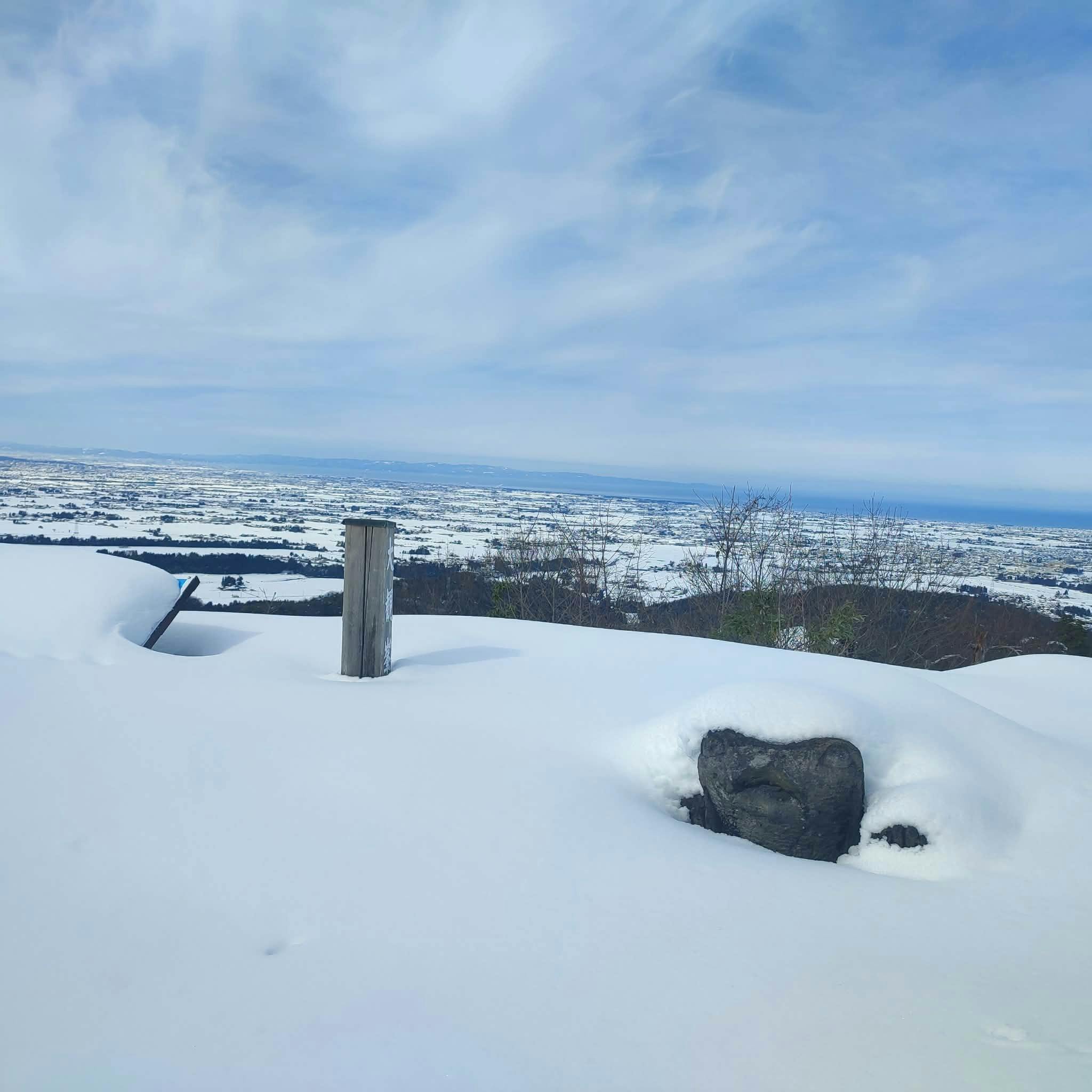 山頂では、おなじみのカエルの置き物も、頭まで雪に埋もれて顔だけチョコンと見えてる状態。