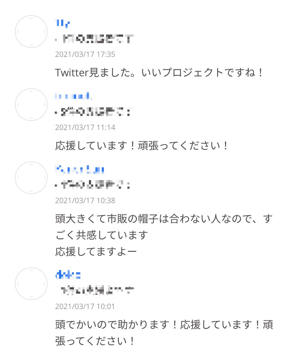 このようにご支援いただいた方から色々なコメントをいただくのですが、自分と同じように頭が大きくて市販の帽子を選ぶのに苦労していた方やこのプロジェクトに賛同してくださる方からのお言葉をひとつひとつ嬉しく読ませていただいています。