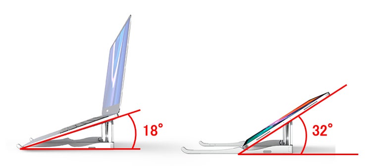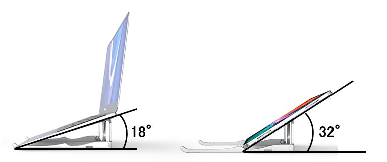 ノートパソコン:18度、タブレット:32度に角度を調節でき、