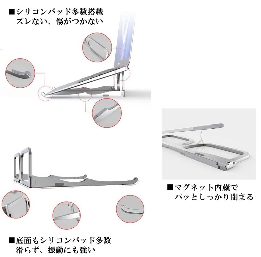 A:少数のパーツで構成されており、各所にシリコン製の滑り止めが取り付けられているため、デバイスを置いてタイピングやタッチ操作をしてもグラつきません。また丈夫なアルミ合金で作られているため、丈夫で傷が付きにくいです。