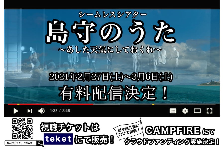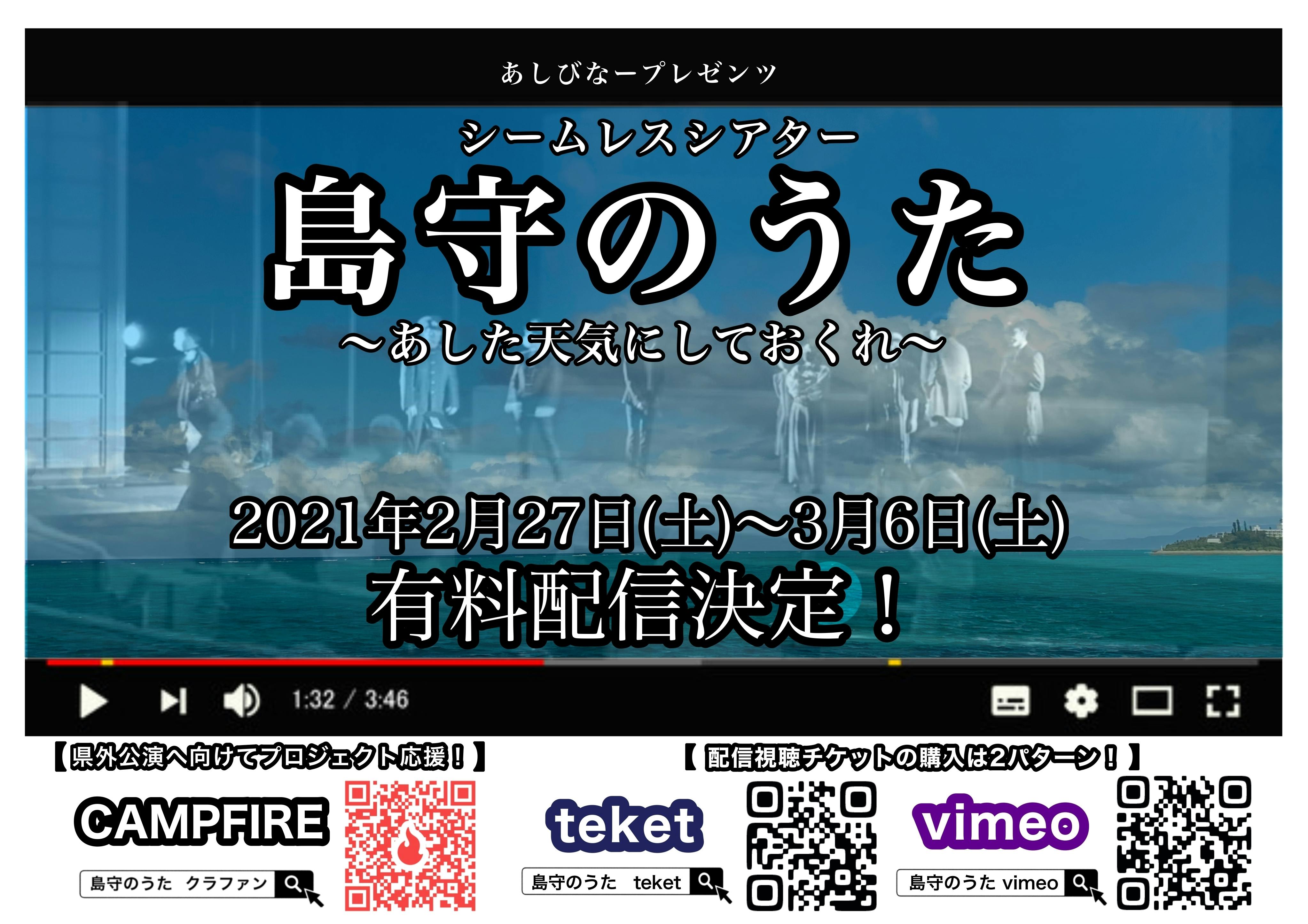 しかし、コロナ禍においても、2020年…戦後75年の節目に沖縄戦時の大きな困難を生き抜いた先人たちの思いを受け継ぎ物語として発信することが大切と考え、シームレスシアター「島守のうた 〜あした天気にしておくれ〜」として創作した舞台を収録し、動画配信という形で沖縄のみならず全国に発信することにいたしました。