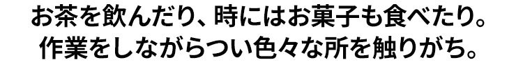 作業の合間のティータイム、お茶を飲んだり、お菓子も食べたり。