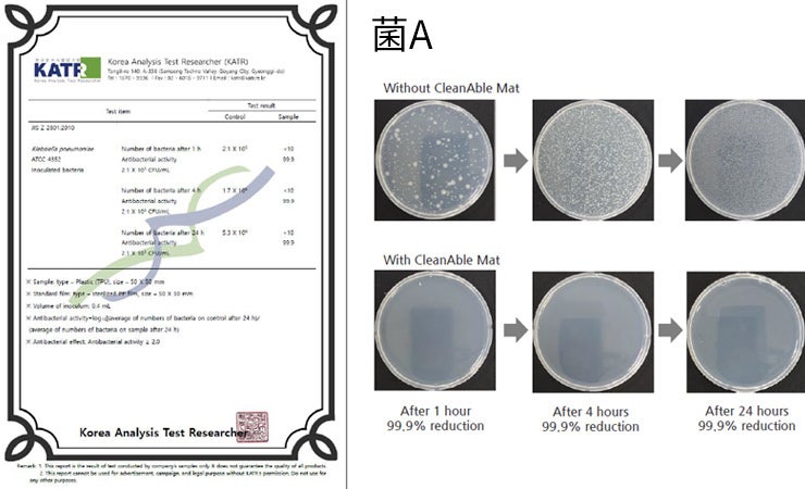 通常菌が付着してから4時間後、24時間後と増殖を繰り返し無数の菌だらけになるところ、この抗菌マットの上に付着した菌Aは、1時間後に99.9%死滅、24時間後もそれをキープ。
