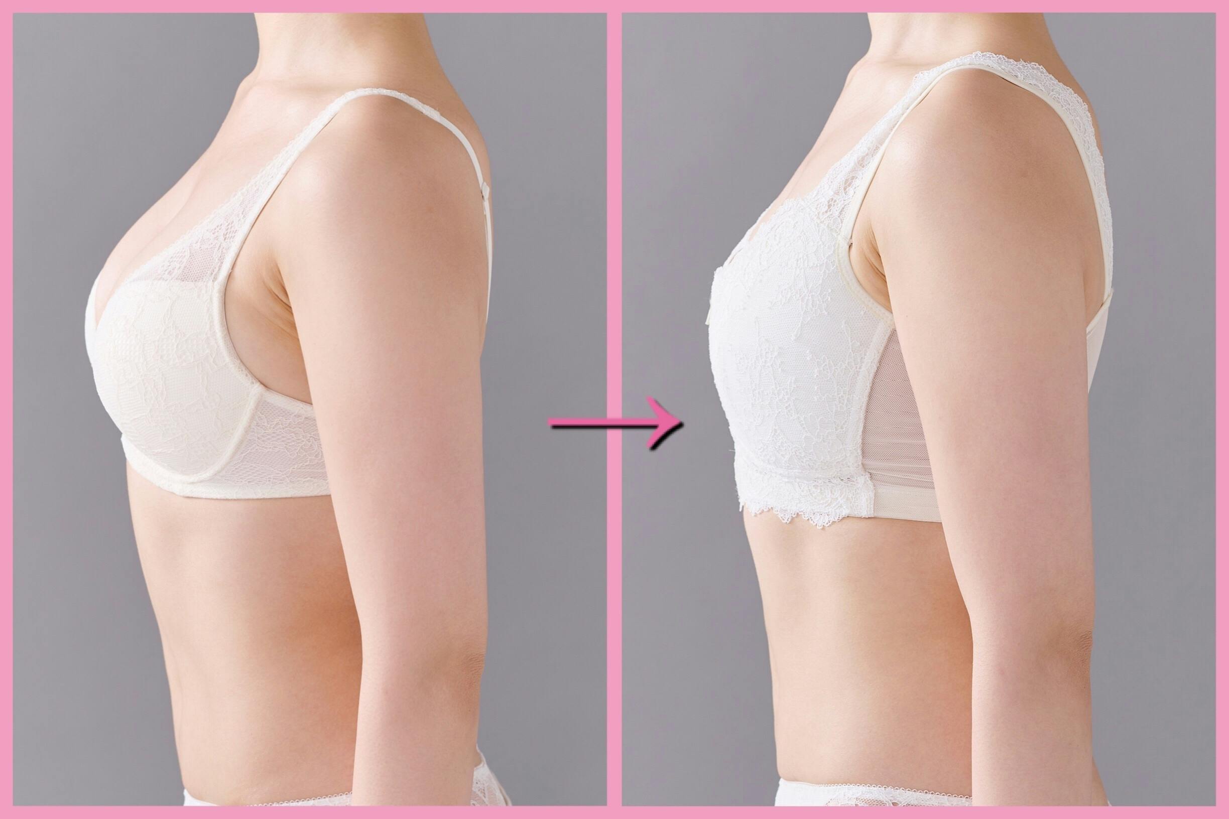 ●両脇からのカップパーツで可能な限りバストを内に寄せながら高さを抑えるパターンを採用しました。バストの高さをデコルテに逃してスッキリ細見え効果もアリ。サイドは深く脇肉もしっかりキャッチ。