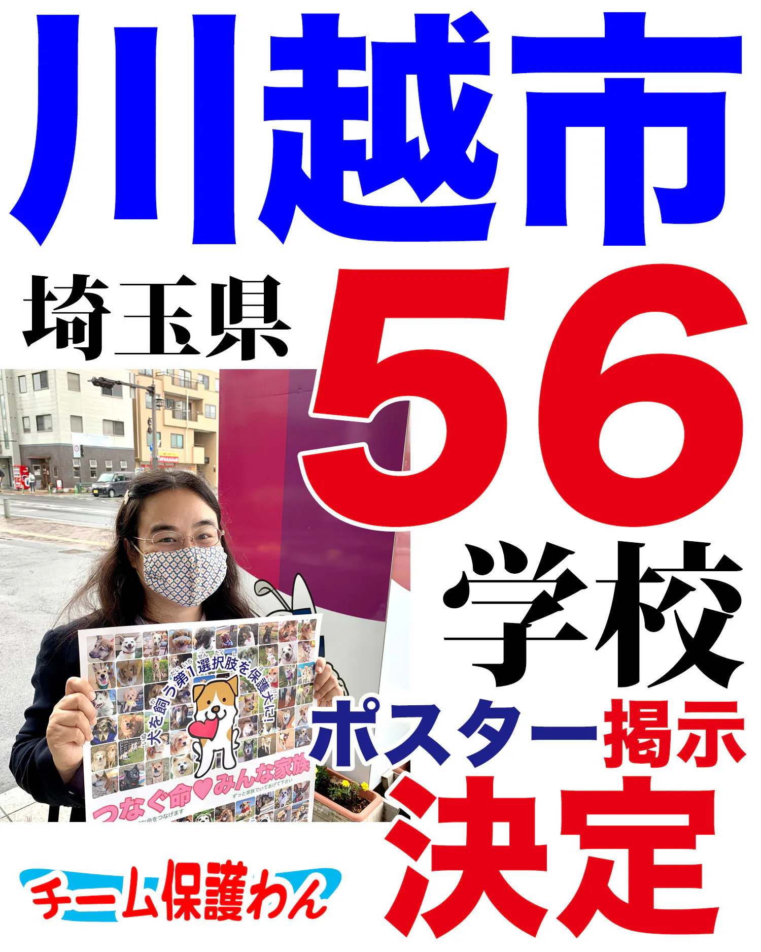 埼玉県川越市の全小中学校等計56校(小学校32校、中学校22校、特別支援学校1校、市立高校1校)に保護犬啓発ポスター(A3サイズ)を掲示して頂ける事になりました!!