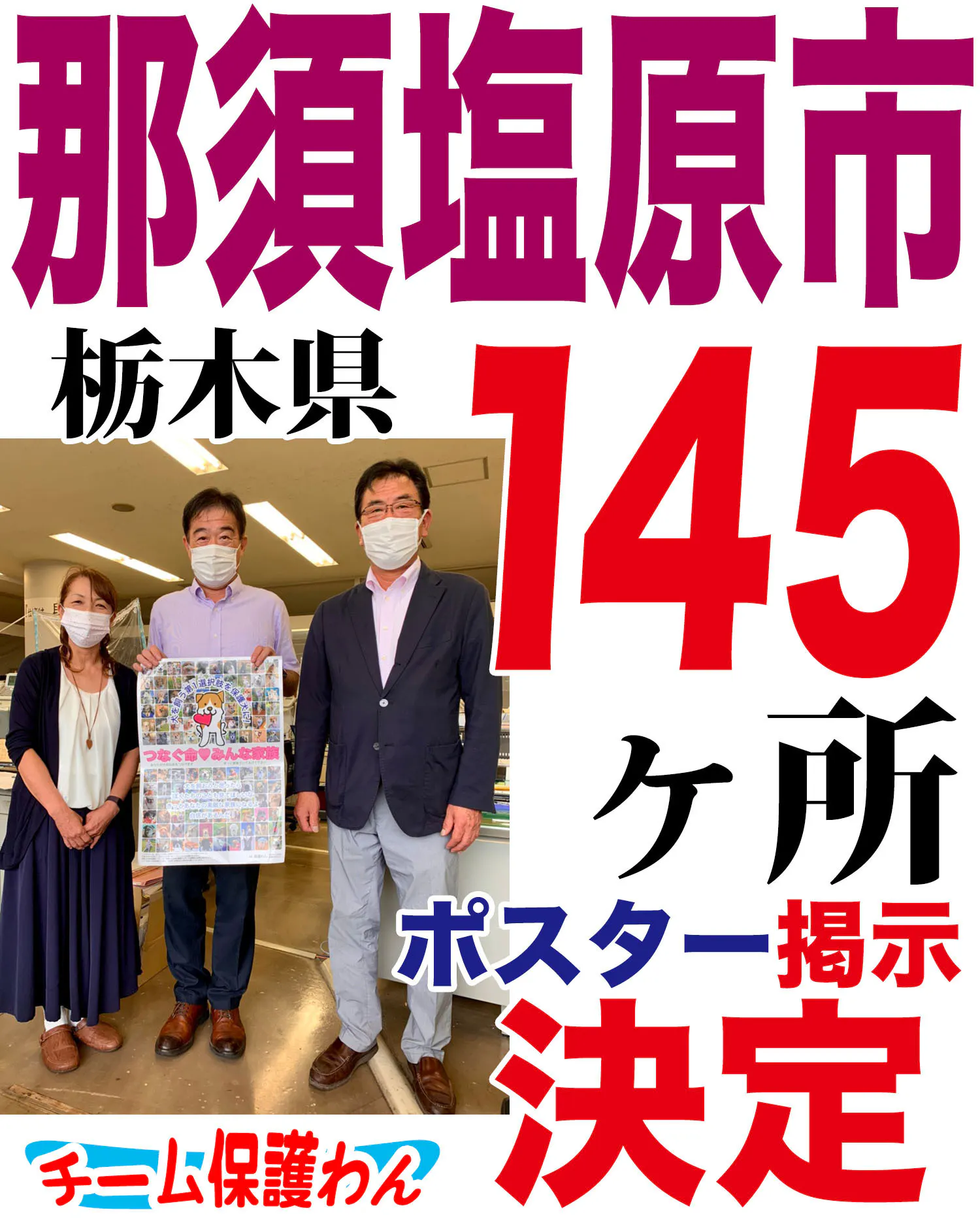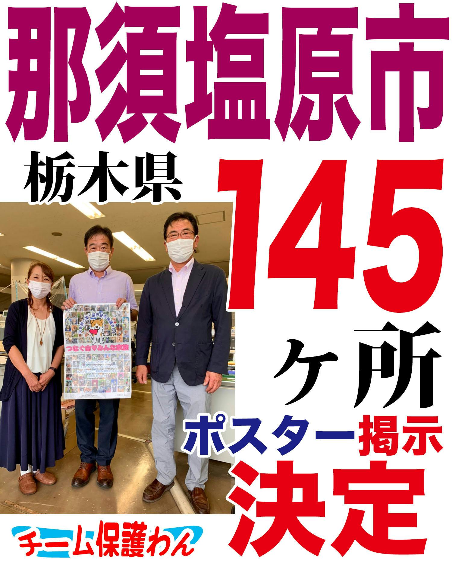 栃木県那須塩原市の全小中学校を含む計145ヶ所(小学校20、中学校10、学童保育50、民間幼稚園33、子育てサロン7、市立保育園10、公民館15 )に保護犬啓発ポスター(A2サイズ)を掲示して頂ける事になりました!!