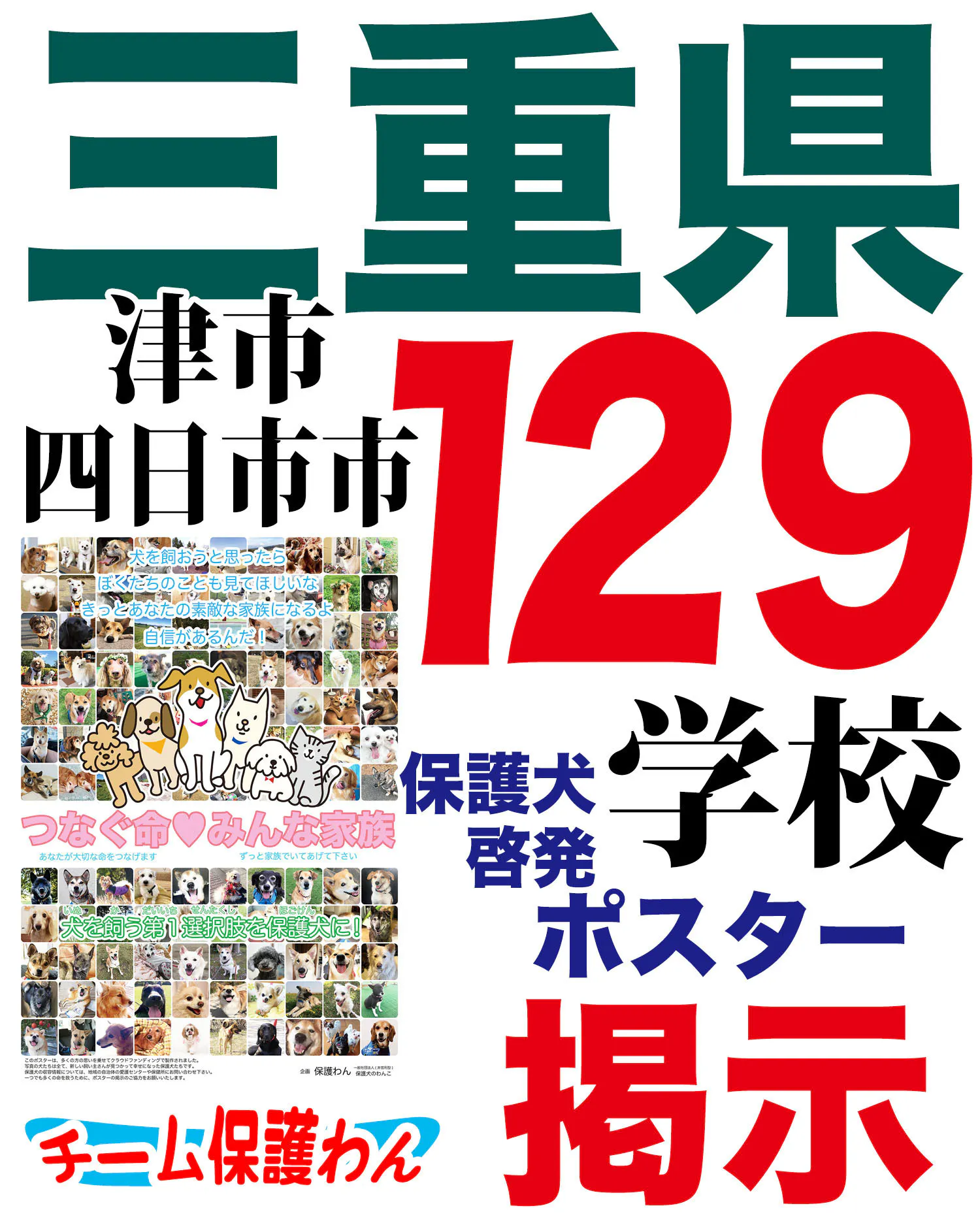 三重県の津市と四日市市の全小中学校など計129ヶ所に保護犬啓発ポスターを掲示して頂ける事になりました!!