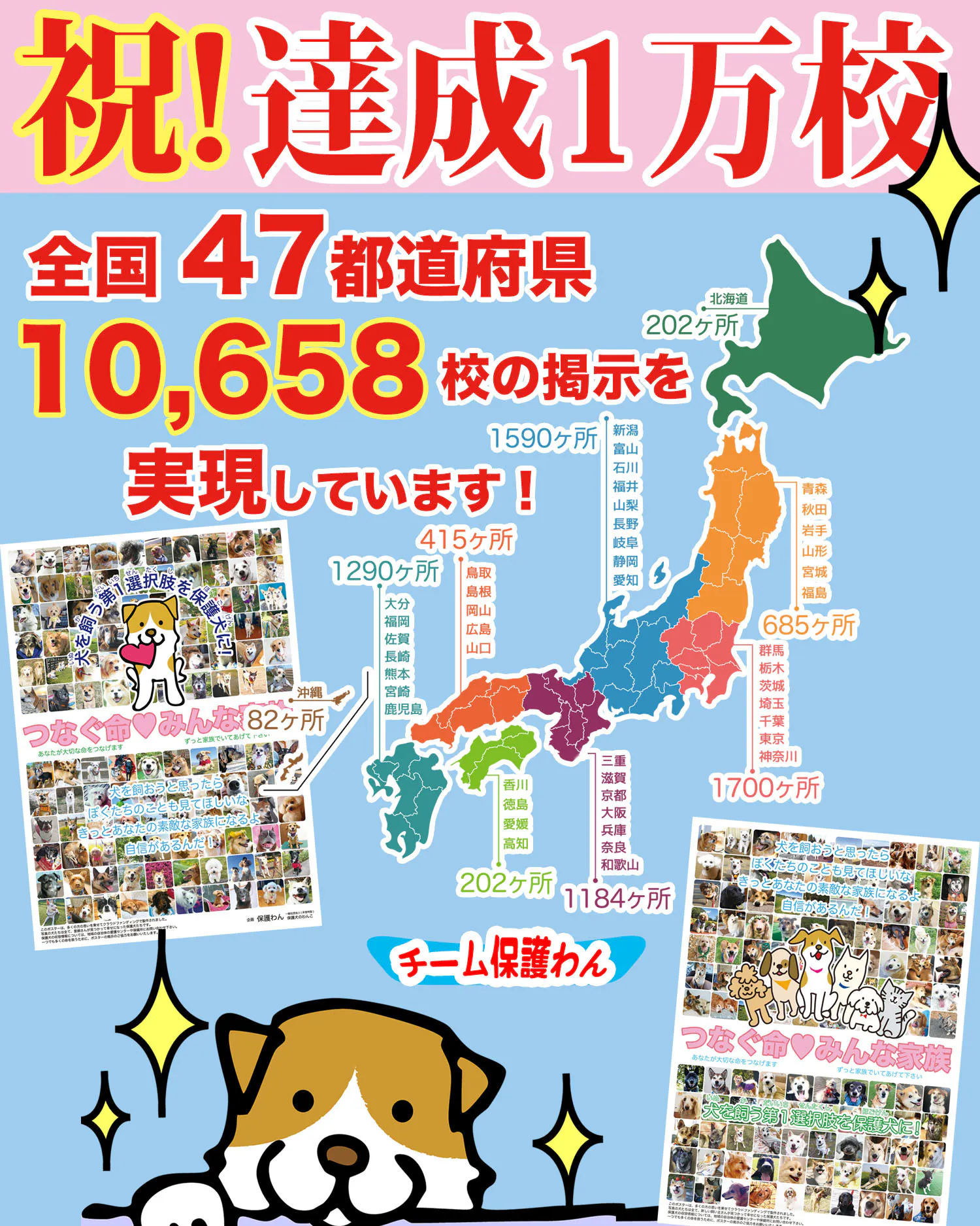 この度、保護犬啓発ポスターの掲示がついに10,658校となって、記念すべき1万校を達成する事が出来ました!!