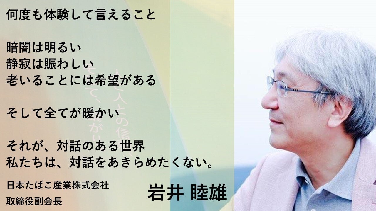 日本たばこ産業株式会社 取締役副会長で、ダイアローグ・ジャパン・ソサエティの理事も務めていただいている岩井 睦雄さんから応援メッセージを頂きました!