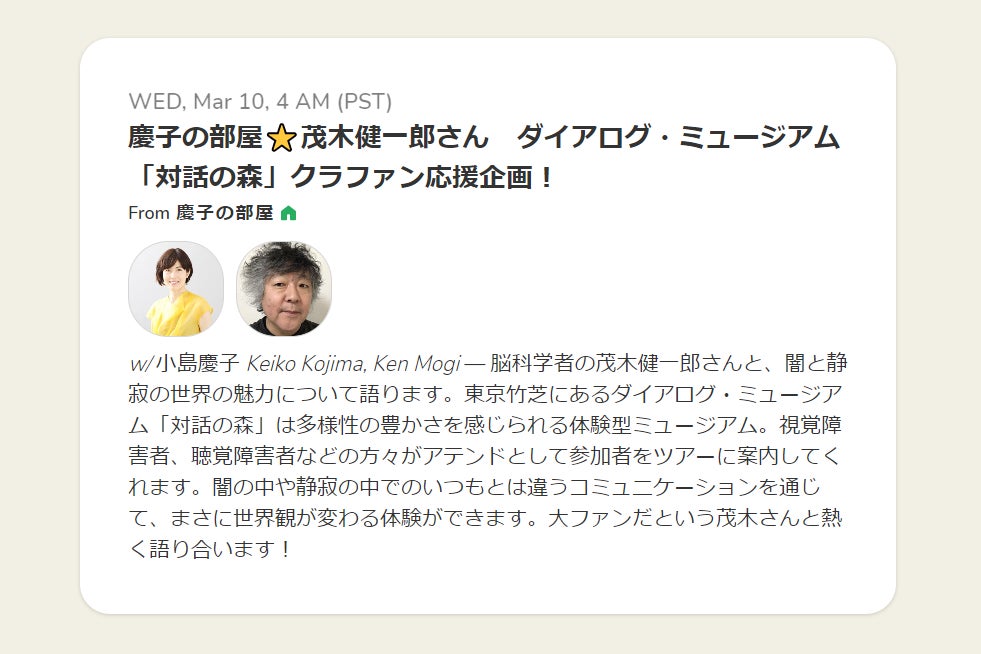 本日3月10日(水)21時より小島慶子さんのclubhouse「慶子の部屋」にて、ダイアログを応援頂いている小島慶子さんと脳科学者の茂木健一郎さんがダイアログミュージアム「対話の森」について熱く語ってくださる予定です!!