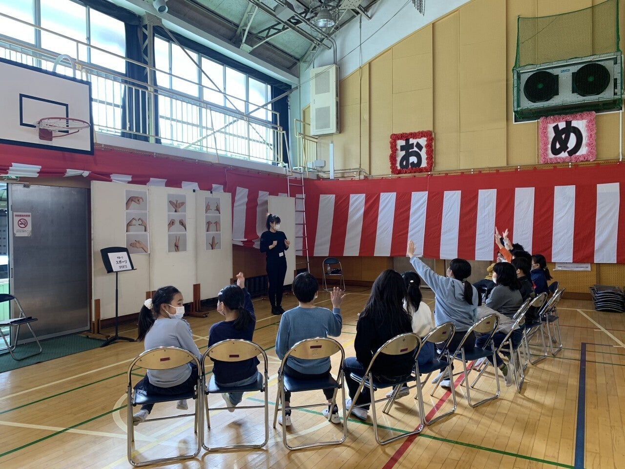 壁にいくつもの写真やイラストが張られた、普段とはしつらえの異なる体育館。見慣れない光景にはしゃぎながら、嬉しそうにおしゃべりをして入ってきた子どもたち。
