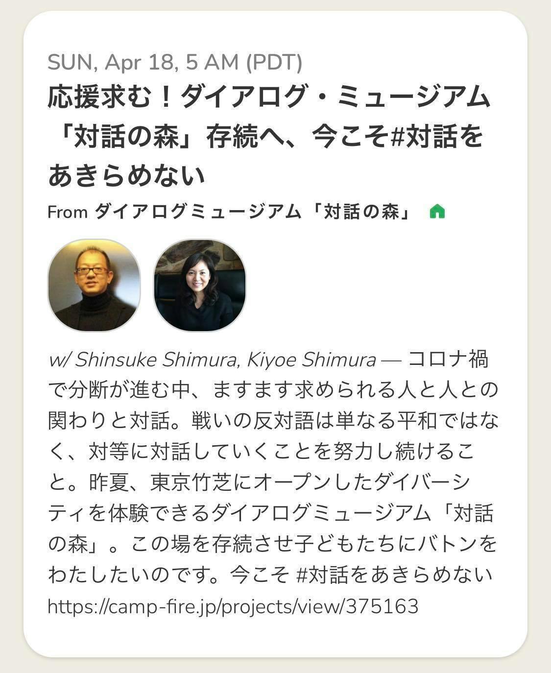 明日18日(日)21時より、代表の志村季世恵・真介が、これまで続けてきたダイアログプロジェクトのこと、コロナ禍での変化と変わらずにいることをclubhouseでお伝えします。