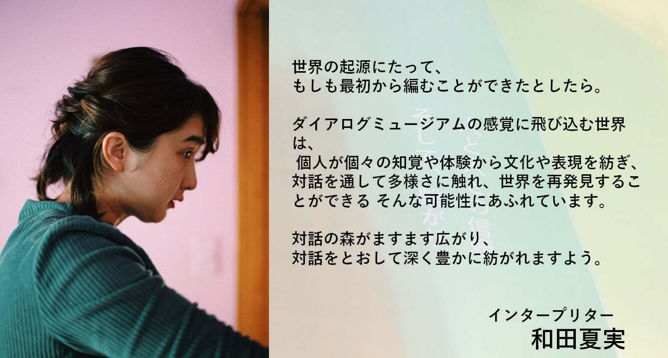 インタープリターの和田夏実さんから応援メッセージをいただきました!世界の起源にたって、もしも最初から編むことができたとしたら。ダイアログミュージアムの感覚に飛び込む世界は、個人が個々の知覚や体験から文化や表現を紡ぎ、 対話を通して多様さに触れ、世界を再発見することができるそんな可能性にあふれています。対話の森がますます広がり、対話をとおして深く豊かに紡がれますよう。和田夏美さんは、ろう者の両親のもと、手話を第一言語として育ち、視覚身体言語の研究、様々な身体性の方々との協働から感覚がもつメディアの可能性について模索しているクリエイターです。さわる会話から生まれた「LINKAGE」「たっちまっち」、手話の視覚化プロジェクト「Visual Creole」などを展開されています。和田さん、いつも応援ありがとうございます!