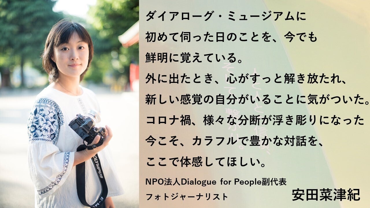 1000万円を突破しました!!ご支援・応援を本当にありがとうございます!!NPO法人Dialogue for People副代表でフォトジャーナリストの安田菜津紀さんから応援メッセージを頂きました。 ダイアローグ・ミュージアムに初めて伺った日のことを、今でも鮮明に覚えている。外に出たとき、心がすっと解き放たれ、新しい感覚の自分がいることに気がついた。コロナ禍、様々な分断が浮き彫りになった今こそ、カラフルで豊かな対話を、ここで体感してほしい。安田菜津紀 さんは16歳のとき、「国境なき子どもたち」友情のレポーターとしてカンボジアで貧困にさらされる子どもたちを取材され、現在、東南アジア、中東、アフリカ、日本国内で難民や貧困、災害の取材、東日本大震災以降は陸前高田市を中心に、被災地を記録し続けています。著書に『写真で伝える仕事 -世界の子どもたちと向き合って-』(日本写真企画)、他。上智大学卒。現在、TBSテレビ『サンデーモーニング』にコメンテーターとして出演中です。菜津紀さん、いつも応援ありがとうございます!
