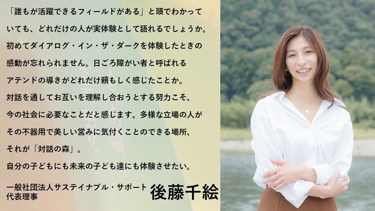 一般社団法人サステイナブル・サポート 代表理事の後藤千絵さんに応援メッセージを頂きました。誰もが活躍できるフィールドがある」と頭でわかっていても、どれだけの人が実体験として語れるでしょうか。初めてダイアログ・イン・ザ・ダークを体験したときの感動が忘れられません。日ごろ障がい者と呼ばれるアテンドの導きがどれだけ頼もしく感じたことか。対話を通してお互いを理解し合おうとする努力こそ、今の社会に必要なことだと感じます。多様な立場の人がその不器用で美しい営みに気付くことのできる場所、それが「対話の森」。自分の子どもにも未来の子ども達にも体験させたい。後藤さん、応援いただきありがとうございます!