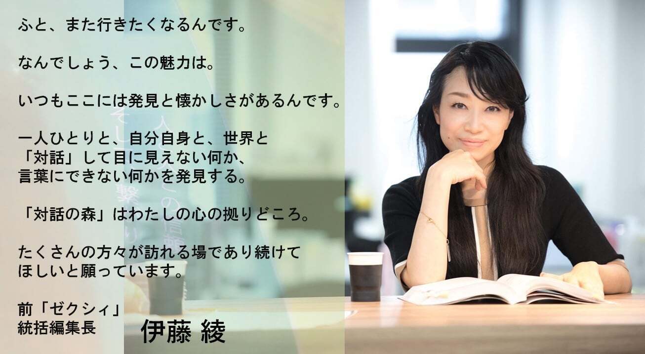 前「ゼクシィ」統括編集長 伊藤 綾さんから応援メッセージを頂きました。ふと、また行きたくなるんです。なんでしょう、この魅力は。いつもここには発見と懐かしさがあるんです。一人ひとりと、自分自身と、世界と「対話」して目に見えない何か、言葉にできない何かを発見する。「対話の森」はわたしの心の拠りどころ。たくさんの方々が訪れる場であり続けてほしいと願っています。伊藤さん、ありがとうございます!
