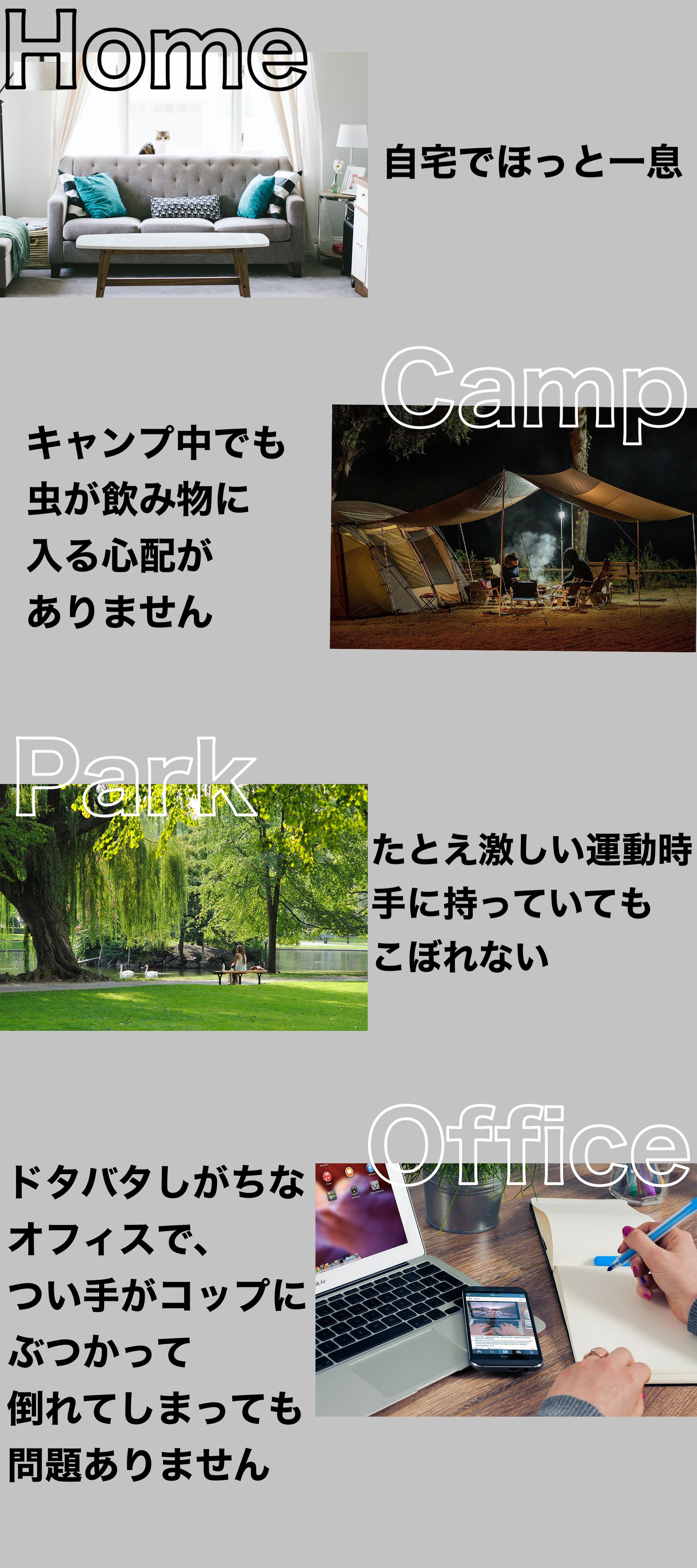 ▼こんな場面に▲自宅での使用用途でも勿論良いですが、蓋が一体型で無くす心配や倒してもこぼす心配がないので、どんどん忙しい場や、アクティブな場面にご使用ください。