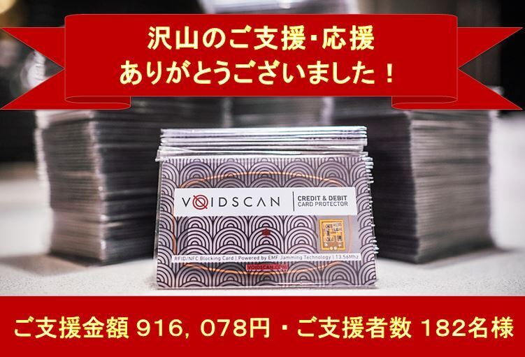 いつも応援ありがとうございます。『VoidScan』プロジェクトオーナーのNishipara Tradingです。昨日、無事に約2カ月間のプロジェクトが終了いたしました!ご支援・応援いただきました皆様に心より感謝御礼申し上げます。本当にありがとうございました!★プロジェクト結果報告・ご支援金額:916,078円・ご支援者数:182名様・達成率:916%予想以上のご支援をいただき、沢山の皆様に『VoidScan』の必要性について共感していただけたことを、大変ありがたく、嬉しく思っております。いただきましたご支援につきましては今後、スキミング対策の重要性・『VoidScan』の必要性をより多くの方にお伝えするための活動資金とさせていただきます。★リターンの発送は、7月頃を予定しております発送準備が整いましたら、ご支援様にはメッセージにてご報告させていただきます。また諸般の事情により発送が遅れる場合は、活動報告もしくはメッセージにてご報告させていただきます。リターンの到着まで今しばらくお待ちください。それでは、今後とも宜しくお願いいたします!Nishipara Trading