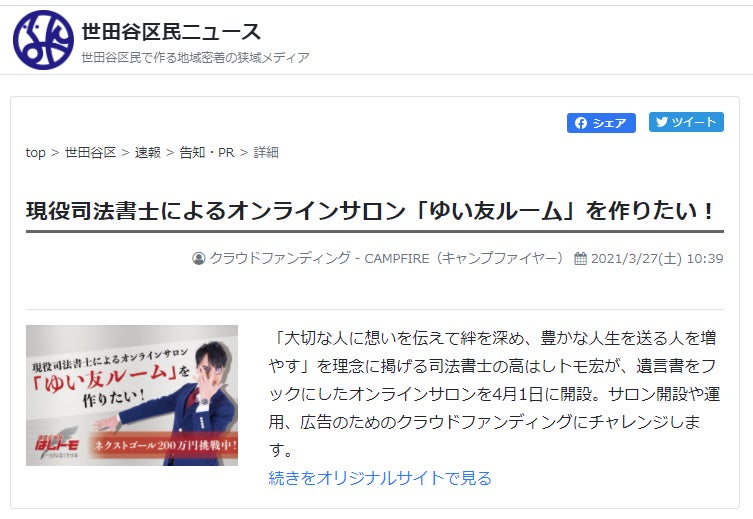 2021/03/27 13:05みなさん、いつも応援ありがとうございます。遺言伝道師はしトモです。本プロジェクトが、世田谷区民ニュースに取り上げられました。現役司法書士によるオンラインサロン「ゆい友ルーム」を作りたい!|世田谷区|世田谷区民ニュースhttps://kumin.news/setagaya/articles/54141活動を広く知ってもらうために、こういったディアに取り上げてもらえるのは嬉しいですね。募集終了まで残り3日。最後まで頑張りますので、応援よろしくお願いいたします! もっと見る