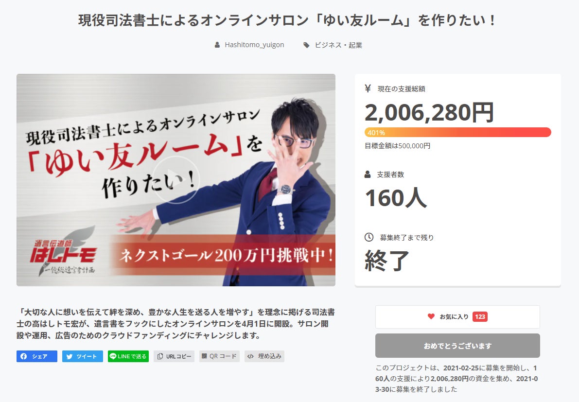 2021/04/01 14:51みなさん、こんにちは。遺言伝道師はしトモです。3月30日に募集終了したクラウドファンディングは、みなさんのご協力のおかげで、無事に成功いたしました。本当にありがとうございます。そして本日、クラウドファンディングの目的であったオンラインサロン「ゆい友ルーム」を開設することができました。ゆい友ルーム | ONLINE SALON by HASHITOMOhttps://yuitomo.jpひとえに、応援してくださったみなさんのおかげです。『大切な人に想いを伝えて絆を深め、豊かな人生を歩む人を増やす』そんな世界を実現するため、「ゆい友ルーム」の仲間を募ってまいります。是非、一緒に「豊かな人生」を探求していきましょう。これからも、応援の程よろしくお願いいたします! もっと見る