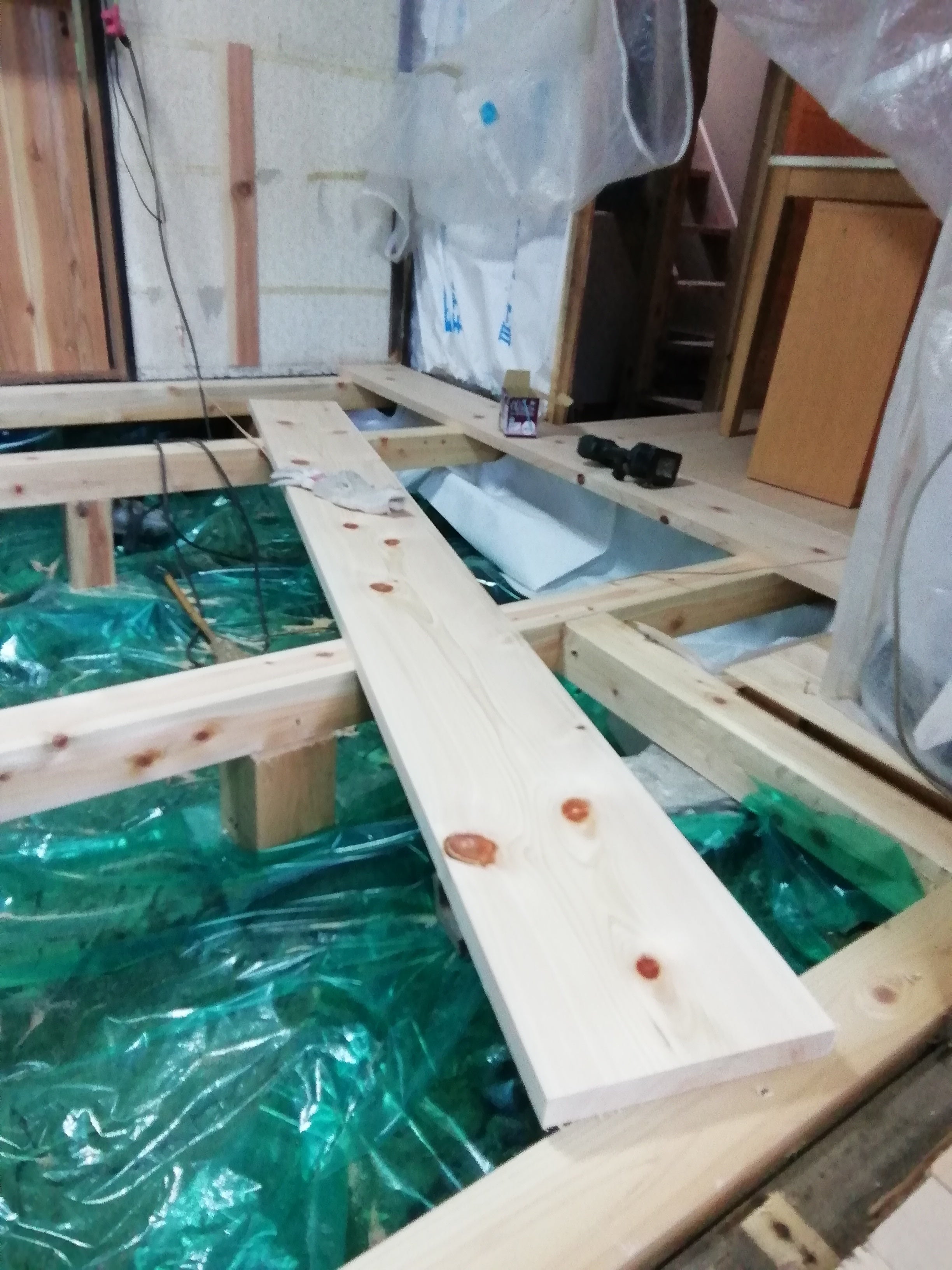 元のフローリングは50年前の物で、この物件を購入してあまりにもブカブカしていたので重ねて貼りました。今回全部取り払いリフォームしています。大引を入れてます。