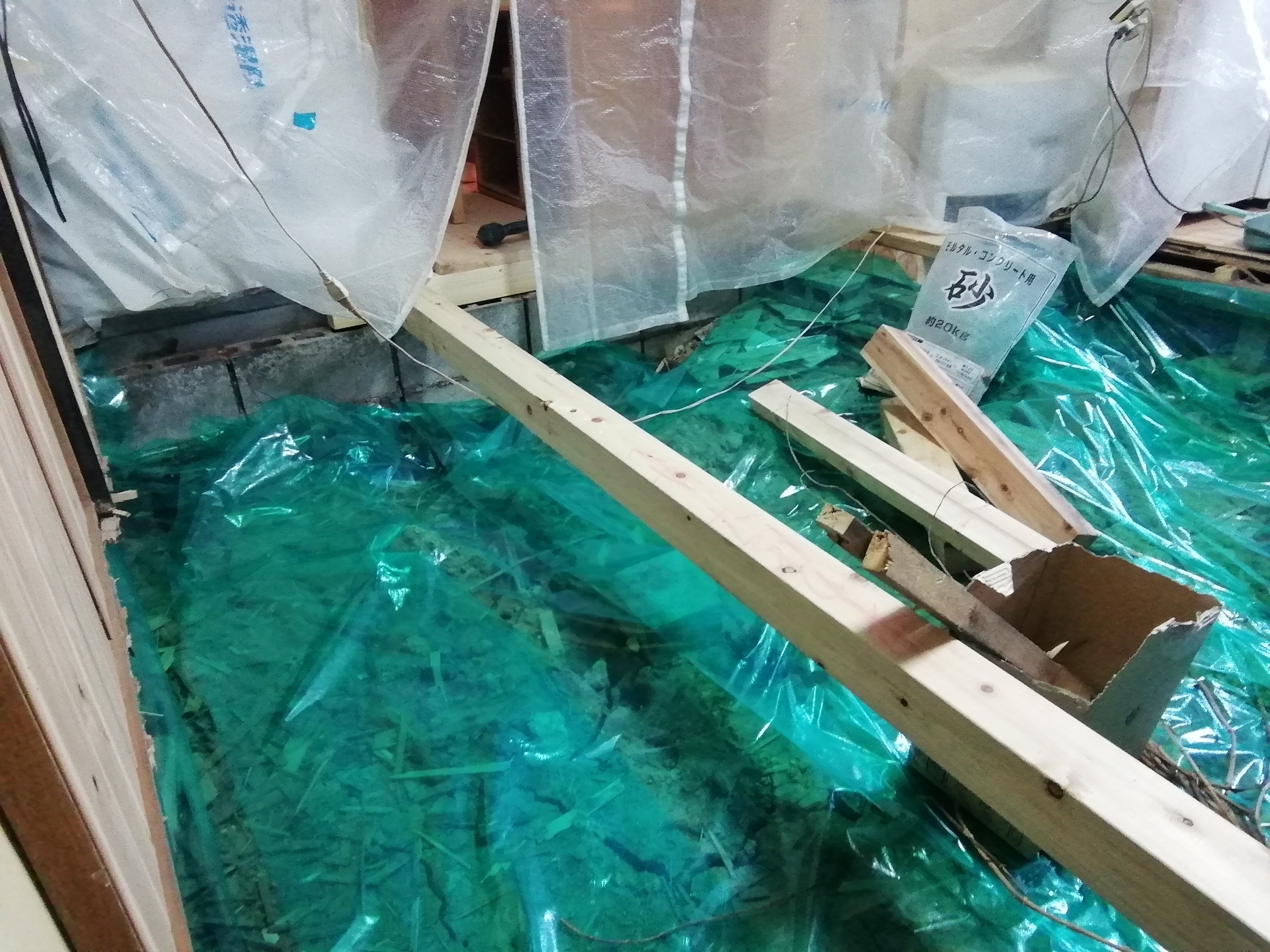 元のフローリングは50年前の物で、この物件を購入してあまりにもブカブカしていたので重ねて貼りました。今回全部取り払いリフォームしています。大引を入れてます。