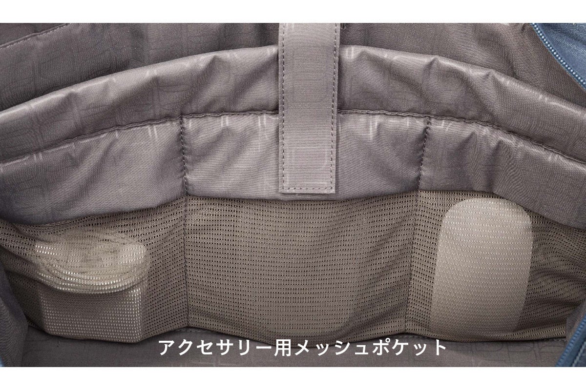 また内部のラップトップポケットの前面にはメッシュポケットが用意されていて、マウスや電源などのアクセサリ小物が収納できます。