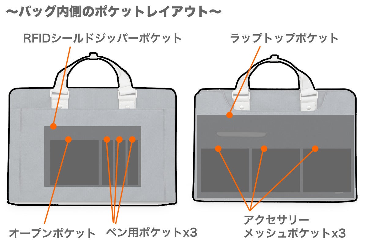 ・内側ポケットx9(ラップトップポケットx1、RFIDシールドジッパーポケットx1、アクセサリーメッシュポケットx3、オープンポケット、ペン用ポケットx3)