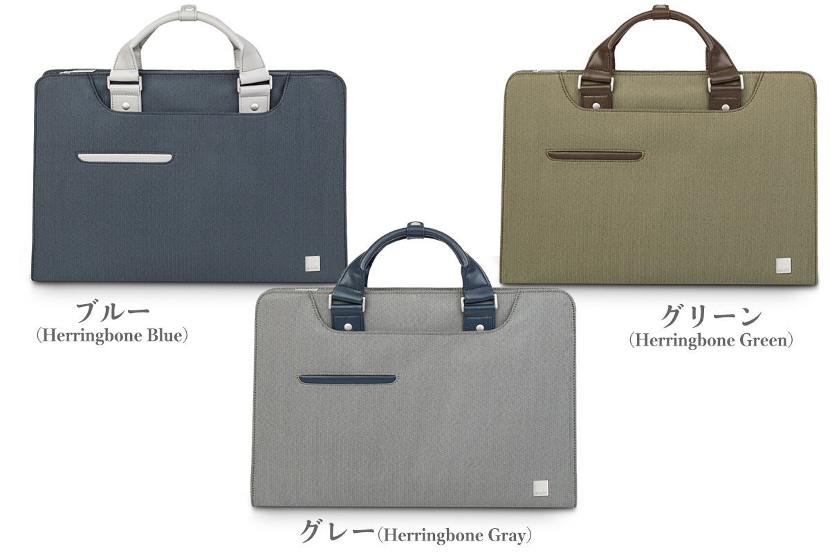 グレー(Heringbone Gray)には、ネイビーブルーのハンドル。グリーン(Heringbone Green)には、ブラウンのハンドル。ブルー(Heringbone Blue)には、グレーのハンドル。