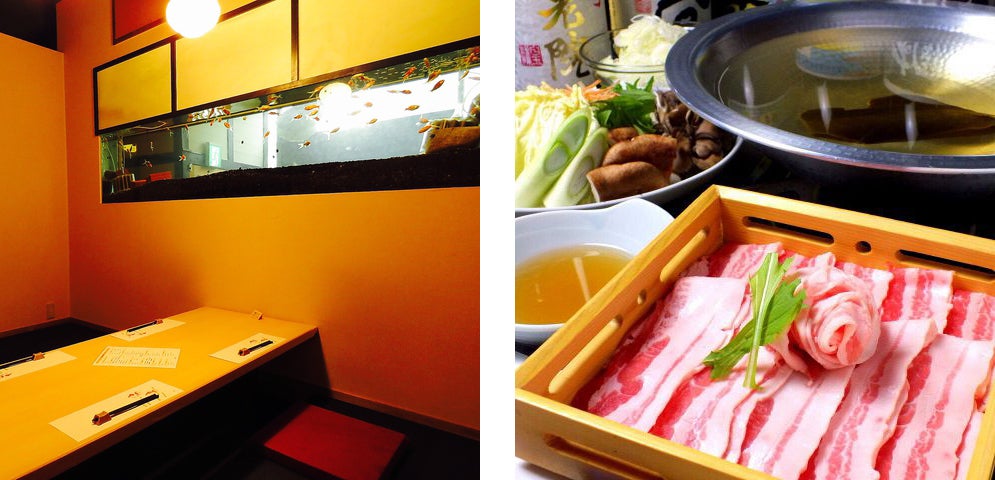掘りごたつ式の完全個室で、大きな水槽で泳ぐ金魚を眺めながらお食事できます。