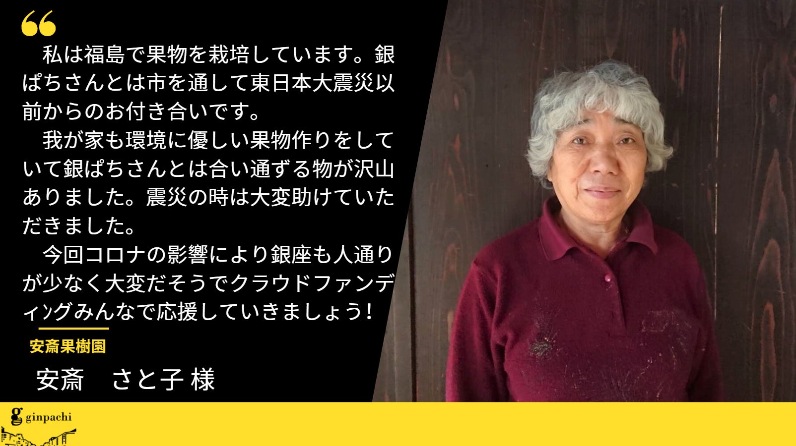 【応援メッセージ】安斎果樹園 安斎 さと子 様私は福島で果物を栽培しています。銀ぱちさんとは市を通して東日本大震災以前からのお付き合いです。我が家も環境に優しい果物作りをしていて銀ぱちさんとは合い通ずる物が沢山ありました。震災の時は大変助けていただきました。今回コロナの影響により銀座も人通りが少なく大変だそうでクラウドファンディングみんなで応援していきましょう!――――――――――――――――――――引き続き応援よろしくお願いいたします。銀座ミツバチプロジェクト