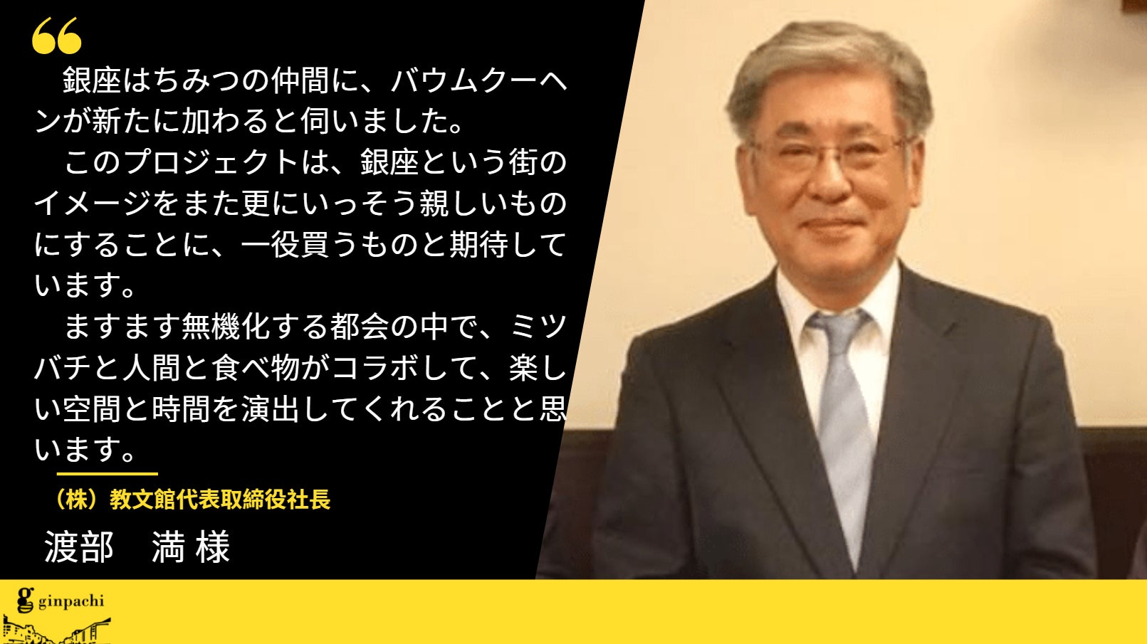【応援メッセージ】株式会社教文館代表取締役社長 渡部 満 様銀座はちみつの仲間に、バウムクーヘンが新たに加わると伺いました。このプロジェクトは、銀座という街のイメージをまた更にいっそう親しいものにすることに、一役買うものと期待しています。ますます無機化する都会の中で、ミツバチと人間と食べ物がコラボして、楽しい空間と時間を演出してくれることと思います。――――――――――――――――――――――――――――――――――引き続き応援よろしくお願いいたします。銀座ミツバチプロジェクト