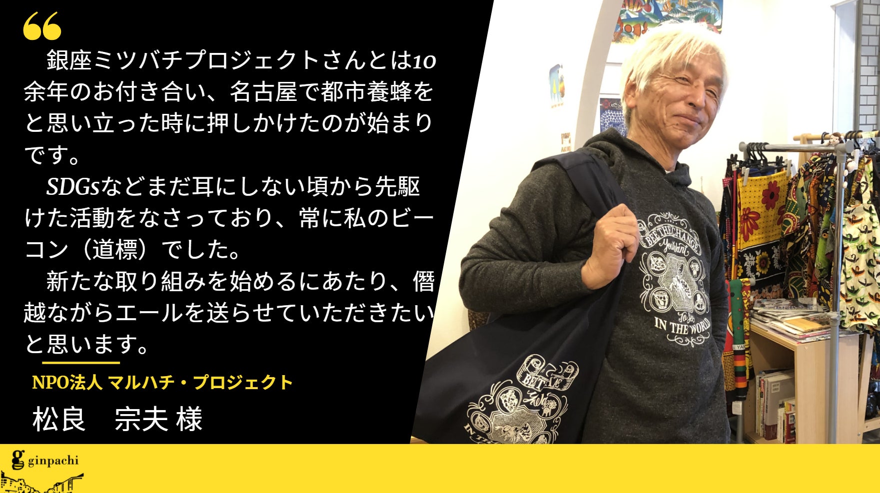 【応援メッセージ】NPO法人 マルハチ・プロジェクト 松良宗夫 様銀座ミツバチプロジェクトさんとは10余年のお付き合い、名古屋で都市養蜂をと思い立った時に押しかけたのが始まりです。SDGsなどまだ耳にしない頃から先駆けた活動をなさっており、常に私のビーコン(道標)でした。新たな取り組みを始めるにあたり、僭越ながらエールを送らせていただきたいと思います。―――――――――――――――――――――――引き続き応援よろしくお願いいたします。銀座ミツバチプロジェクト
