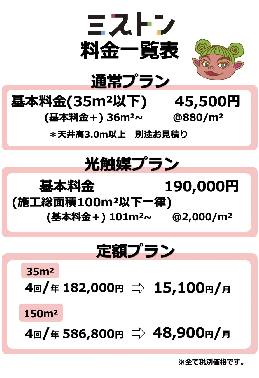 ミストンでは、除菌サービスの費用は上記のようになっております。