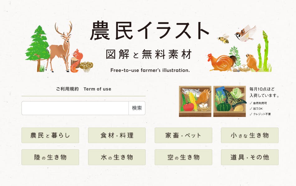 農民イラストは図鑑的な機能も持っていて、すべての素材に「#」がついています。農民イラストの「#」を使いこなすと動植物の分類や田舎の暮らしを学ぶこともできます。例えば、「#葉菜類」「#魚類」「#収穫」などなど。素材を増やしながら#のバリエーションも増やしていきます。リクエストいただいた素材にはお客さま専用の#をおつけします。