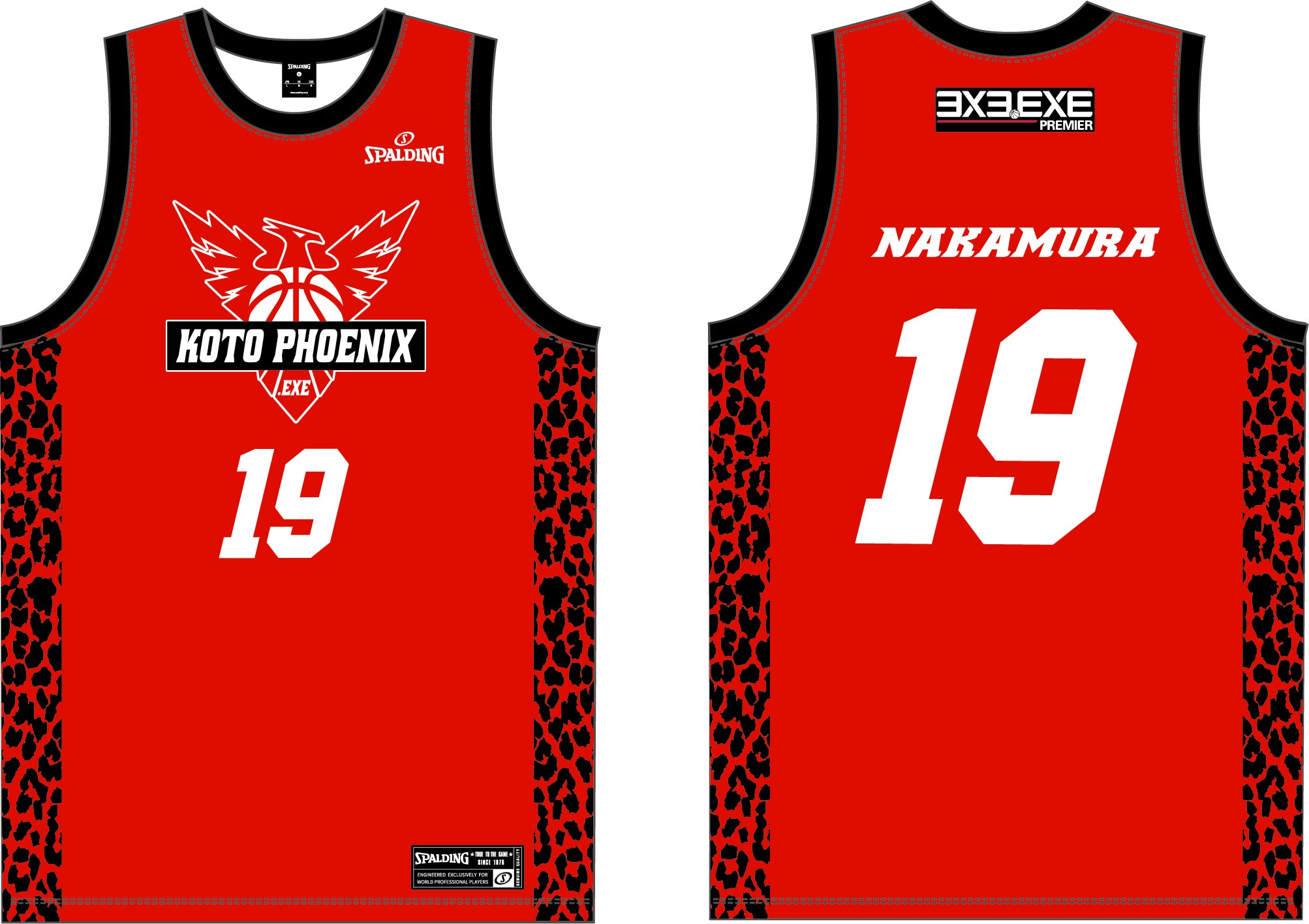 ご支援頂いた皆様に普段から気軽にご使用いただきたいので、KOTO PHOENIXのロゴ等は配置せずに、KOTO PHOENIXのユニホームと同じ赤黒のヒョウ柄でSPALDINGのロゴをデザインいたしました。