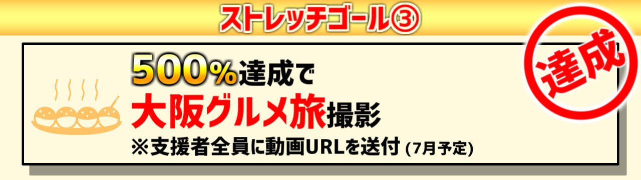皆様からの熱いご支援のおかげで500%達成いたしました。約束の通り、「大阪グルメ旅」が撮影決定となりました。 ありがとうございます。支援してくださった皆様への公開は7月頃を予定しております。