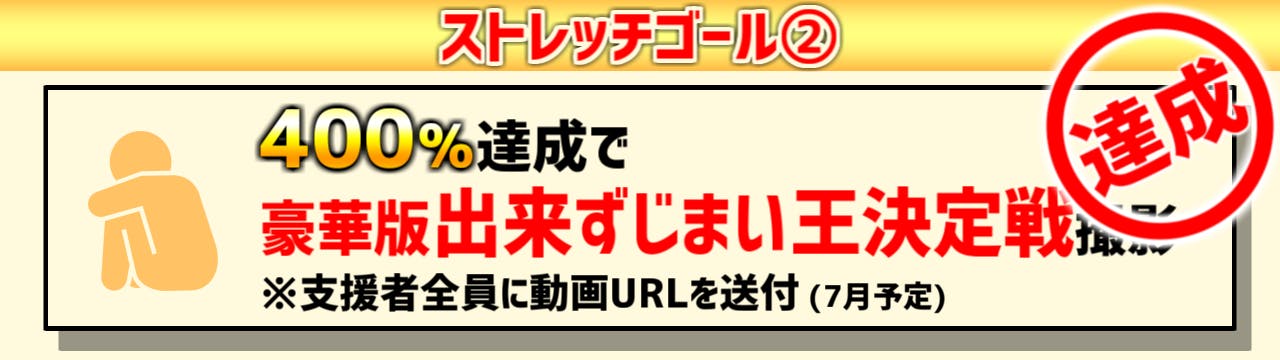 我々も流石にもうこれ以上はないと言いながらストレッチゴールを決めているんですが、皆様からの熱いご支援のおかげで400%達成いたしました。約束の通り、「豪華版出来ずじまい王決定戦」が撮影決定となりました。 ありがとうございます。支援してくださった皆様への公開は7月頃を予定しております。