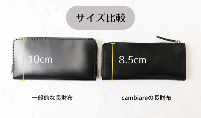 この財布は持つ時、置く時、開く時、閉める時、あらゆる場面に抜群のフィット感で手のひらに収まってくれます。このフィット感は従来の一般的な長財布よりも1.5cm小さくすることで生まれました。何度も試作を重ね、1mm単位で調整をして、お札が噛まない絶妙なサイズダウンに成功。